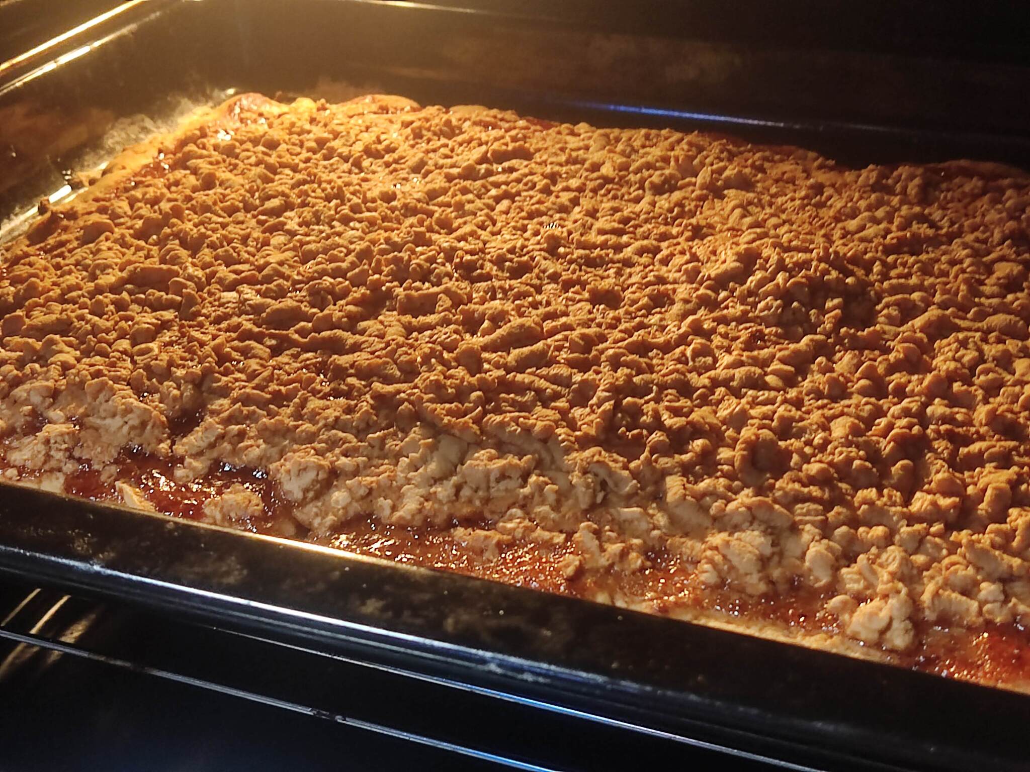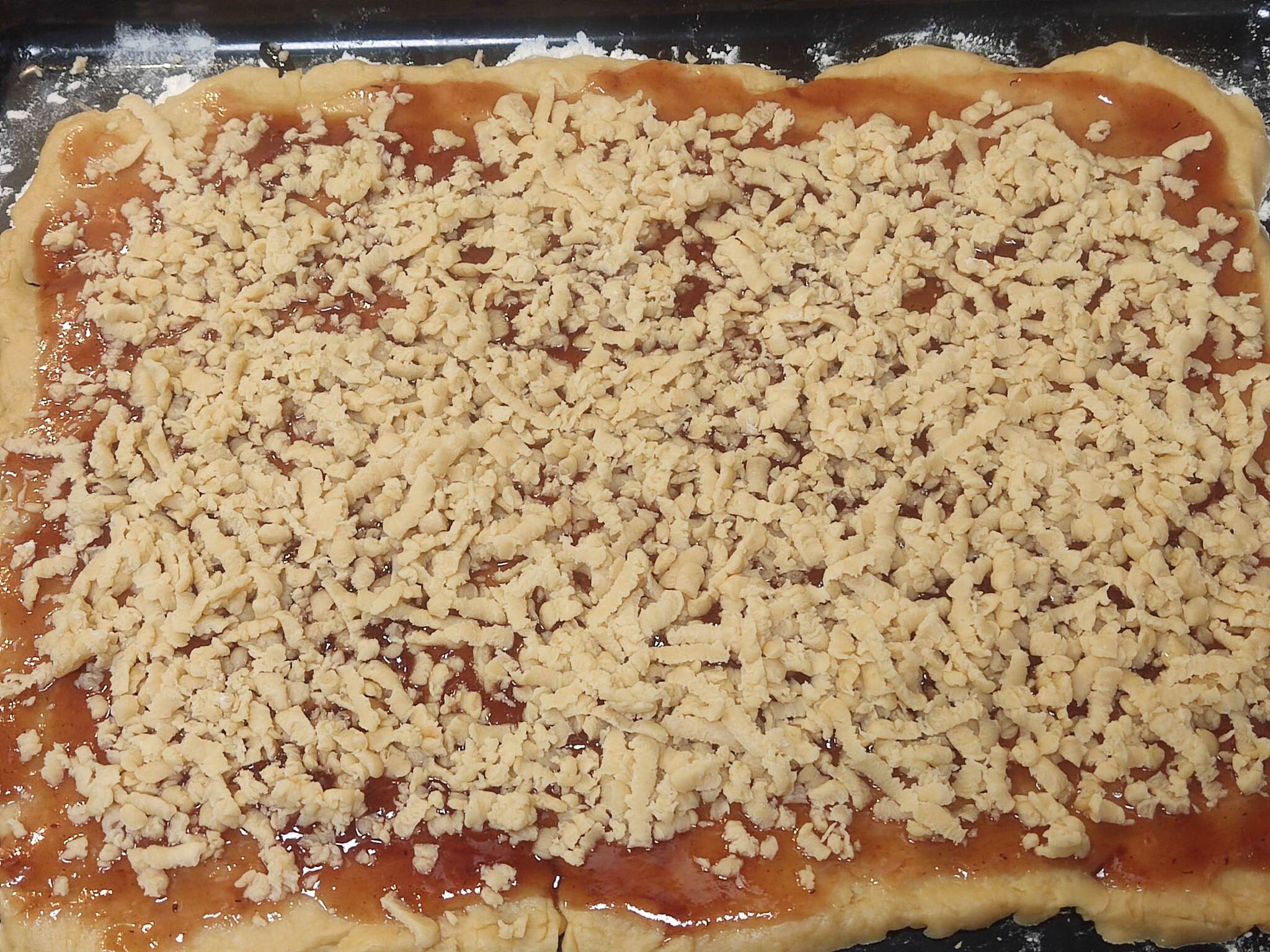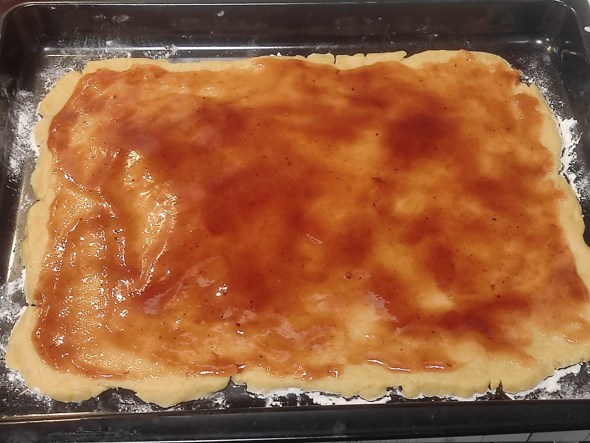 Противень слегка посыпаем мукой, на него выкладываем оставшиеся 2/3 теста и раскатываем по всему противню. Сверху мажем вареньем, покрывая всю площадь.
