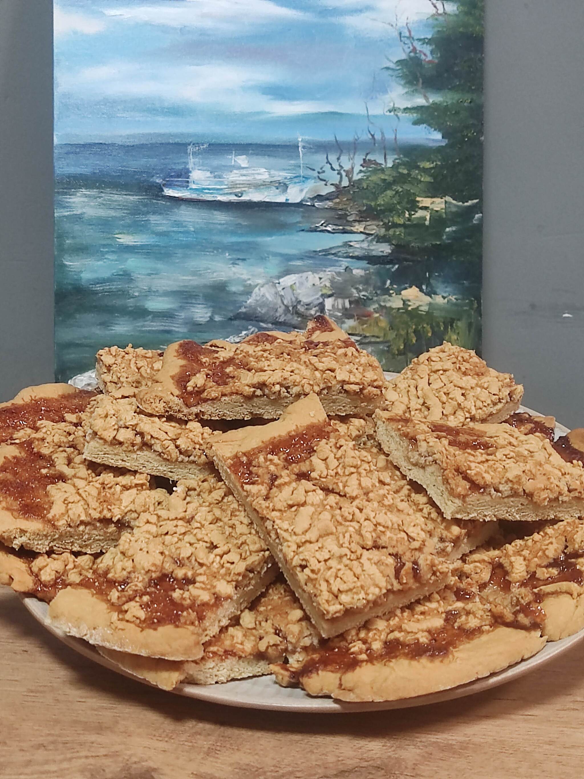 Готовое печенье достаём, пока горячее разрезаем сразу на противне. Красиво выкладываем на тарелку, зовём близких пить чай и обсуждать, как прошёл день.