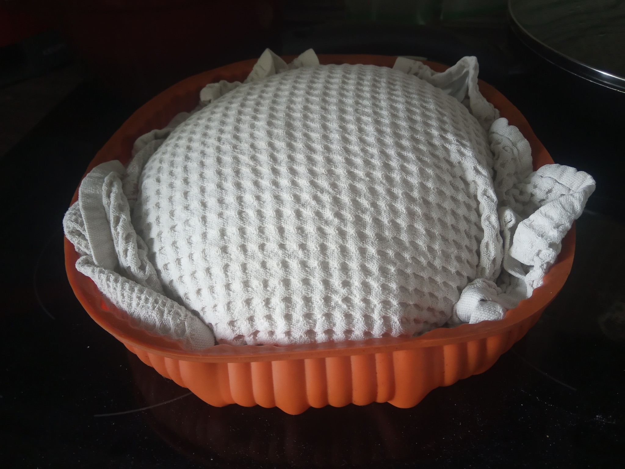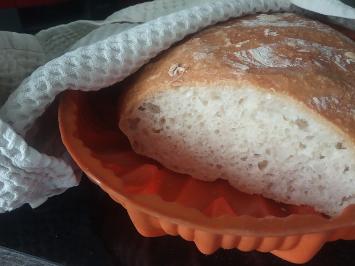 После того, как вытащил, корка казалась слишком жёсткой. 15 минут в полотенце - и произошло чудо, стало возможным продавить пальцем! Хрустящая булка готова. Результат понравился.