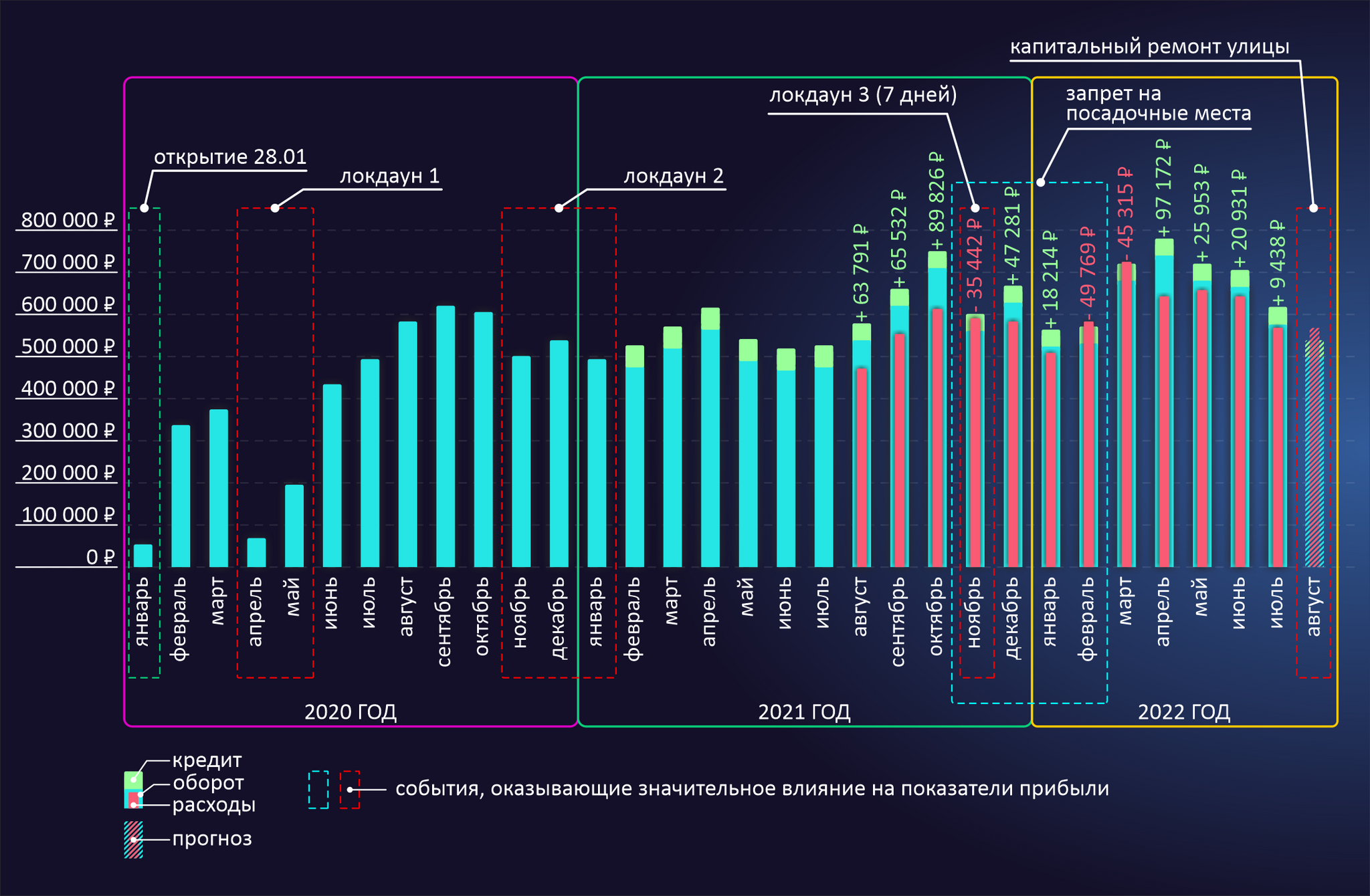На графике я отметил события, которые в значительной степени повлияли на прибыль пекарни, так же в теле доходов есть, так скажем, "надстройка" над основным оборотом - это кредит, который в начале деятельности покрывался с зарплаты по основному месту работы, но, примерно с февраля 2021 покрывается с доходов пекарни. Платеж составляет 40 000 руб. То, что касается цифр на графике, то они не учитывают этот кредит. Выходит, что к цифрам на графике можно добавлять 40 000 руб. и засчитать их в доход (на самом деле следовало бы уменьшить расходы на графике на эту сумму, но я заметил это когда график был уже готово, а потратил я на него много времени и переделывать уже не стал. Думаю это не сильно исказит информацию). Но это так, отступление.