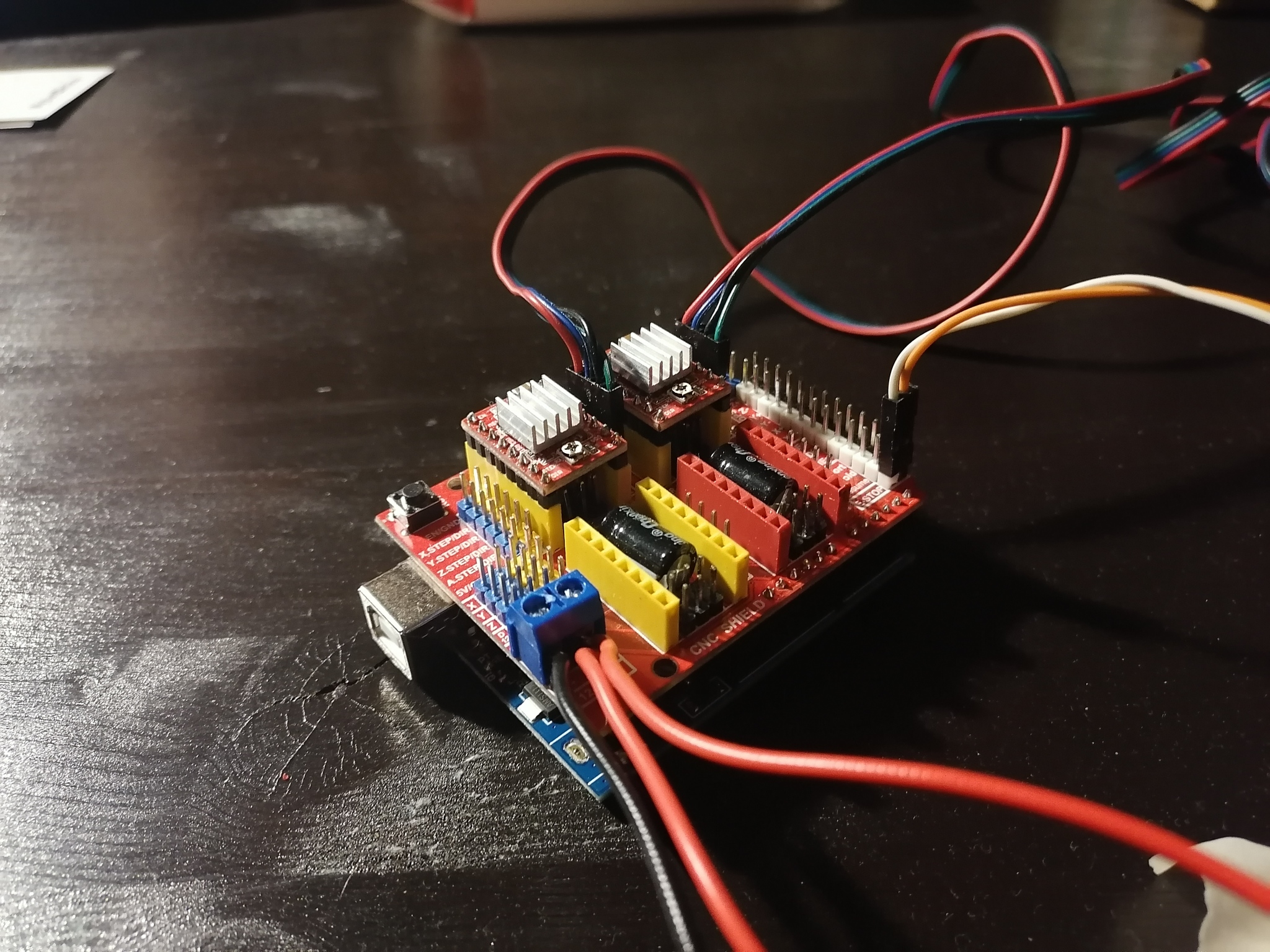 В общем, с платы ардуино снял порт питания, сверху поставил cnc shield. В Cnc shield установил драйвера, предварительно замкнув контакты настройки шага двигателей, подал питание и выставил подстроечным резистором на драйверах 0,8В. Двигатели 1,7А.