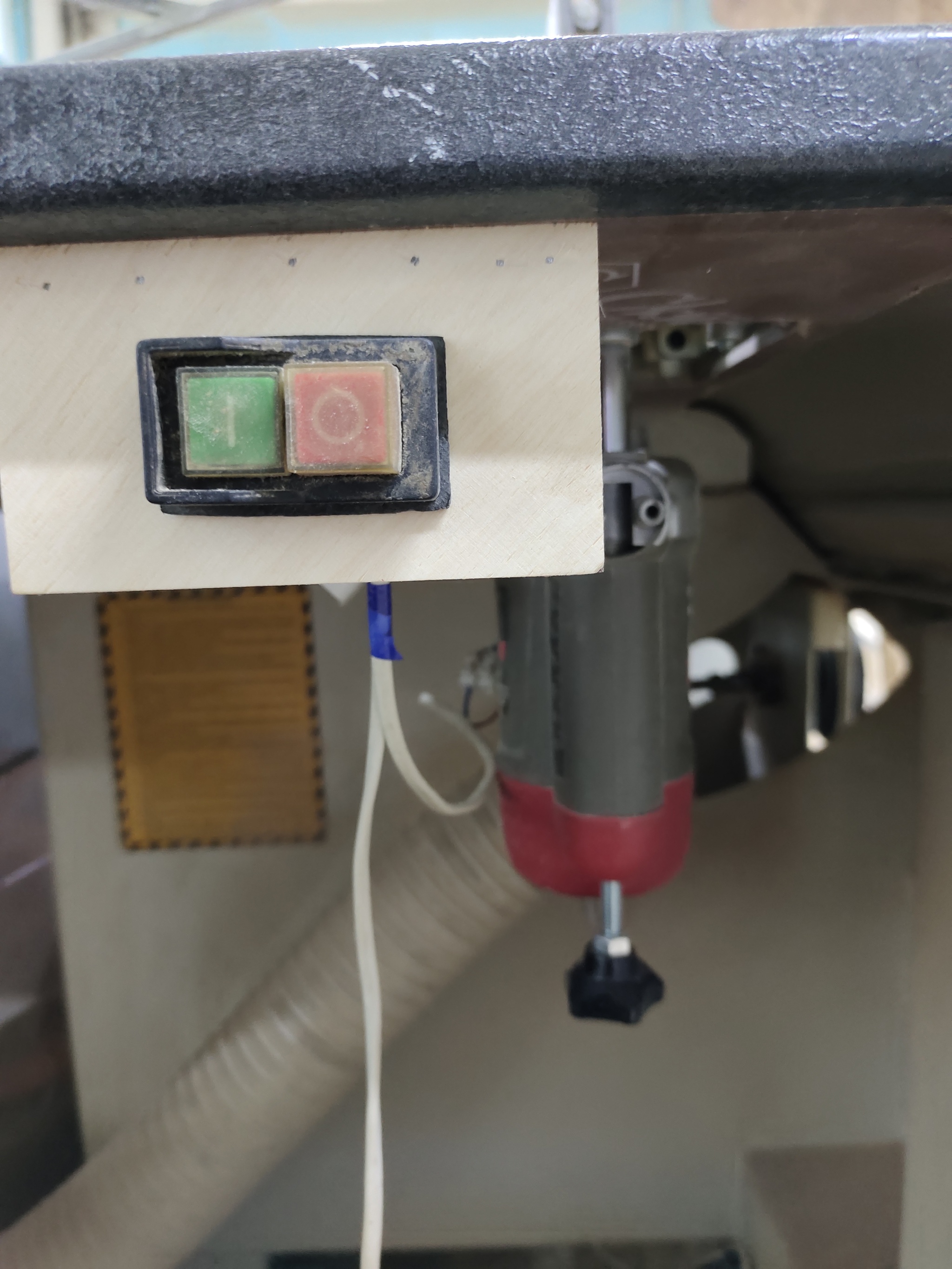 Шпильку можно и короче. Но все равно фрезер под столом не видно. А так показалось проще будет не глядя ловить рукой. Ручек с кнопкой нет уже давно, упирались в столешницу.