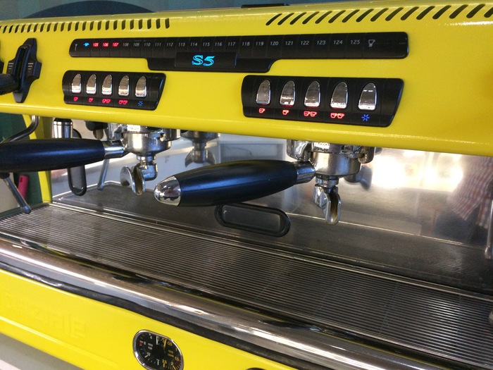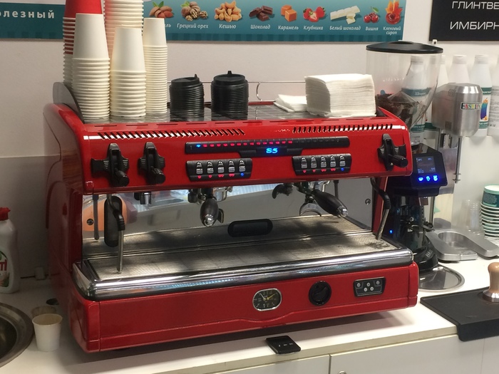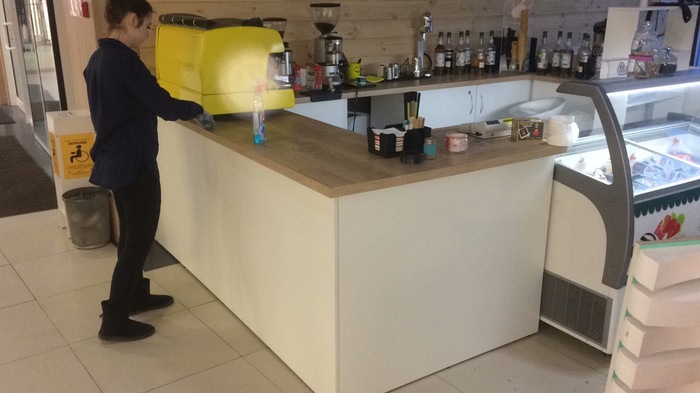 Желтое - кофемашина, черный куб - витрина для мороженого. Синий кубик - витрина для выпечки (точнее, куб из стекла).