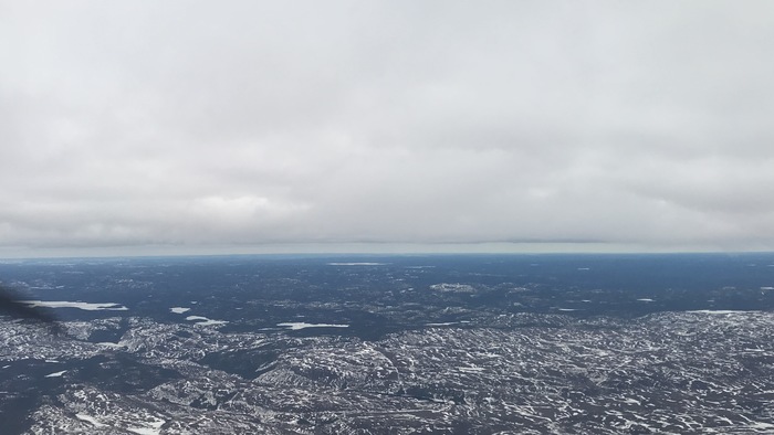 Пока была связь,я проинформировал диспетчера о том,что мне необходимо снижение,он разрешил,но подчеркнул,что не может дать снижение ниже минимально безопасной высоты(МБВ). Но даже на МБВ я цеплял облака,поэтому был вынужден снизиться еще ниже,внизу были замерзшие реки и озера,иногда встречались маленькие водопады,казалось,что можно будет разглядеть даже медведя или снежного человека)) Фото не передаёт всей красоты,которая мне открывалась из кабины. Кое-как через другие борты я доложил диспетчеру,что связь неустойчивая и дальнейшая контрольная связь будет через час. Дальше полёт проходил в режиме радиомолчания и только за 100 миль до входа в зону аэродрома Goose Bay я начал маломальски слышать диспетчера,получил новые указания и взял курс прямо на приводной маяк аэродрома. Далее был визуальный заход,во время выполнения разворота на посадочный курс в правом баке уже загорелась сигнализация малого остатка топлива,оно и понятно. После посадки топлива оставалось еще где-то на час полёта. Пограничники проверили паспорт (наличие визы необязательно для экипажа),попросили заполнить какую-то форму всвязи с короной и строго-настрого сказали сидеть в отеле до вылета. Уже тогда я знал,что скорее всего из-за погоды меня ждёт несколько «веселых» дней взаперти в отеле.