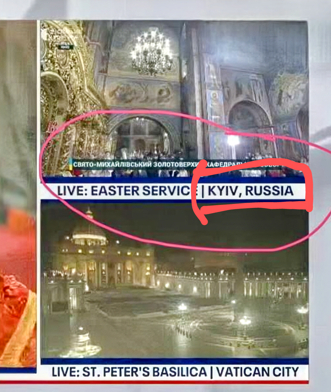 американский канал Fox News показал в эфире трансляцию богослужения из Москвы с участием патриарха Кирилла, а на соседнем изображении Свято-Михайловского золотоверхого собора в плашке указал "Киев, Россия". Позже ошибку исправили, но осадок на Украине остался.