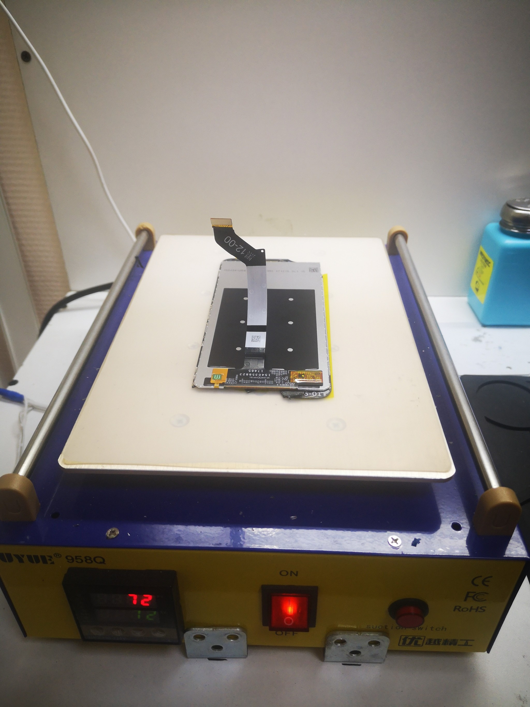 Достали всё лишнее, теперь начинаем самое сложное - снимаем дисплей из рамы. Для этого опять подогреваем на сепараторе, добавляем немного спирта и аккуратности.