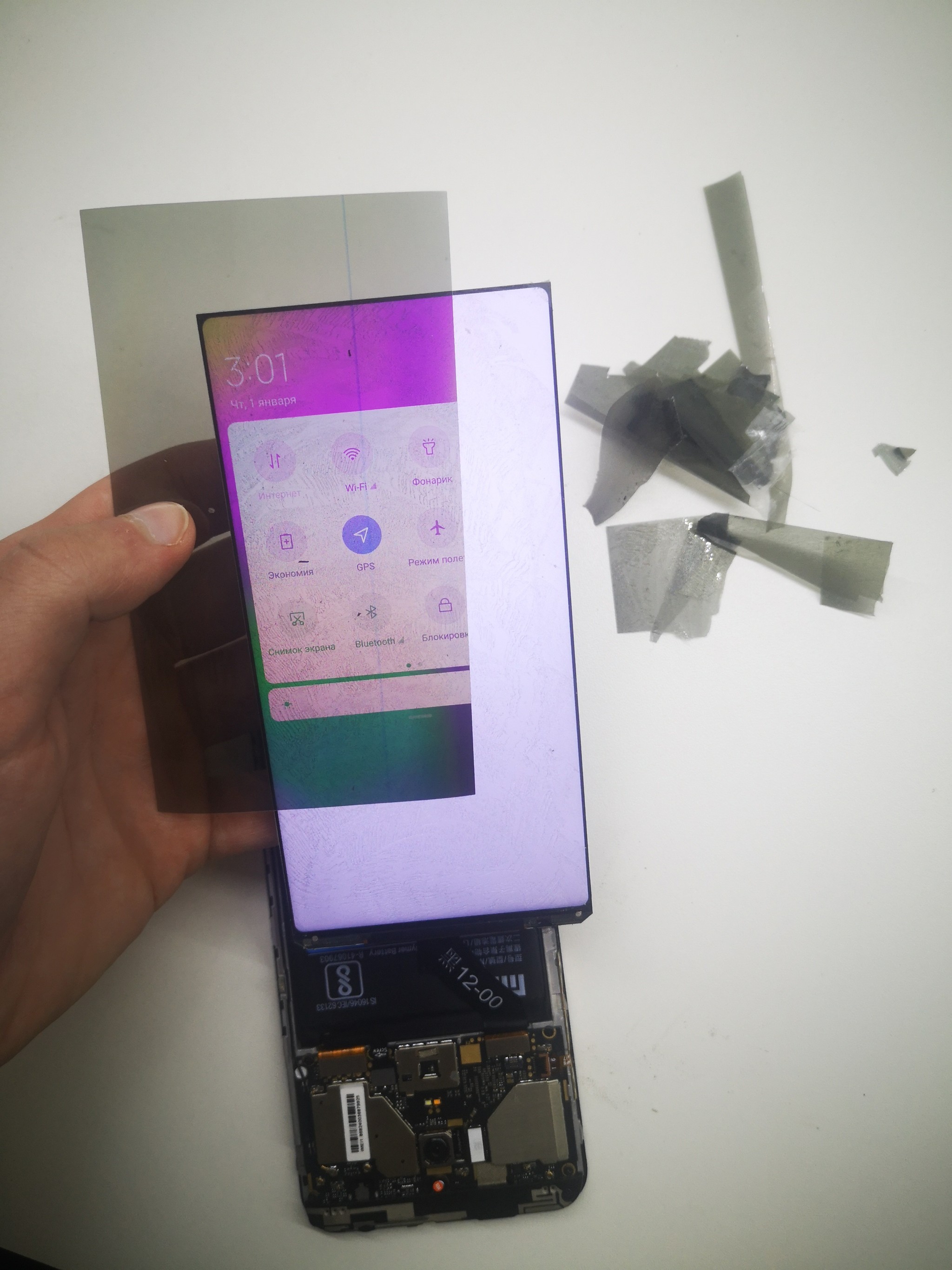 На всякий случай проверяем дисплей, что не пошли пятна или полосы. Ничего нет, начинаем срезку стекла.