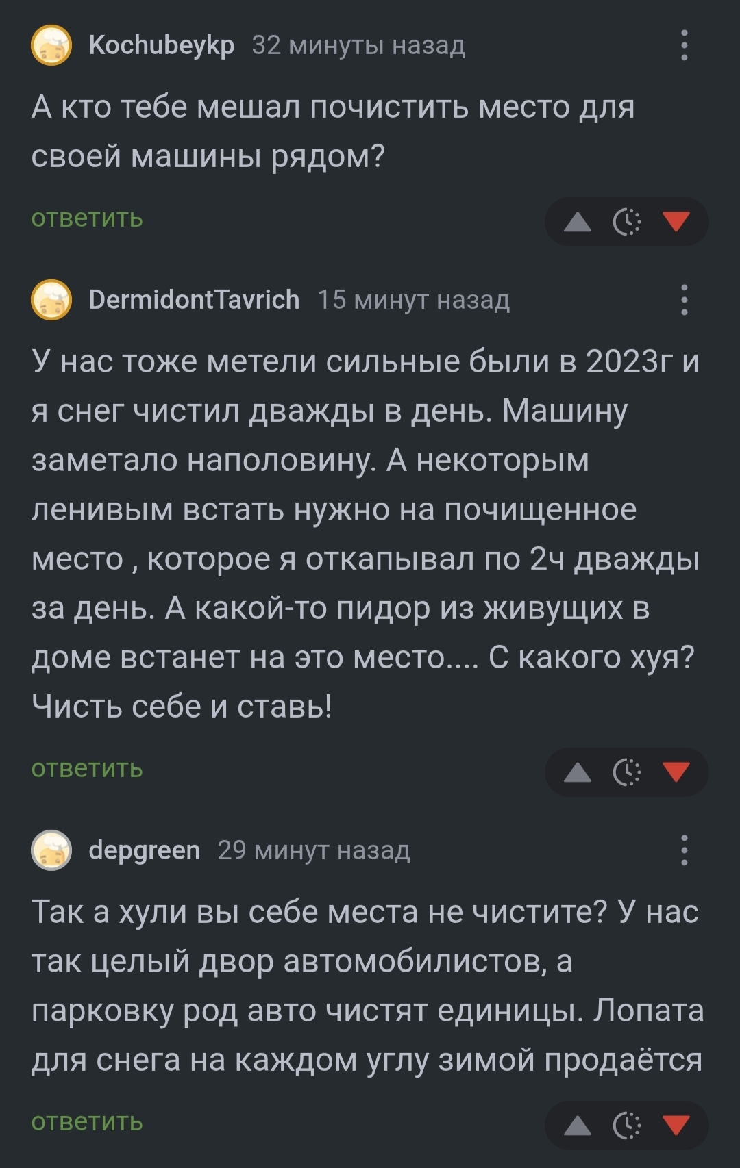 Сосед по несчастью сказал, что перекрывший нас чистит себе это место и место рядом для своей жены, соответсвенно считает их "своими" (для адептов "я почистил - место мое" сразу скажу, что места на организованной асфальтированной парковке, а не на пустыре/газоне рядом).