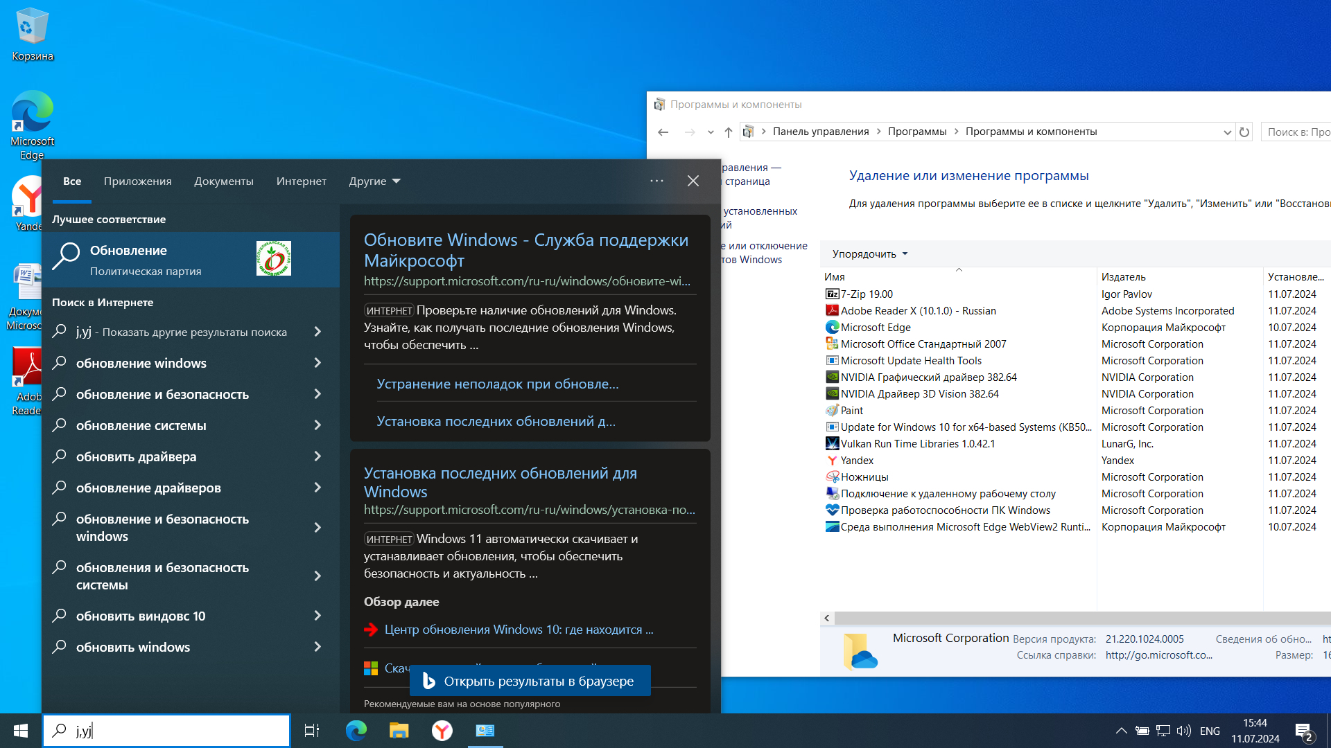 При подключенном интернет-соединении при наборе слова "обновление" в строке поиска в ОС лучшим совпадением считается... некая Политическая партия "Обновление"! Что странно, такое "лучшее совпадение" появляется при наборе с английской раскладки, с русской подобной ереси замечено не было.