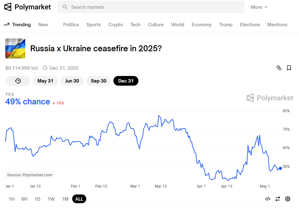 Платформа ставок, можно типа поглядеть как в западном мире оценивают вероятность того или иного события. Ссыль на тему перемирия с Украиной: