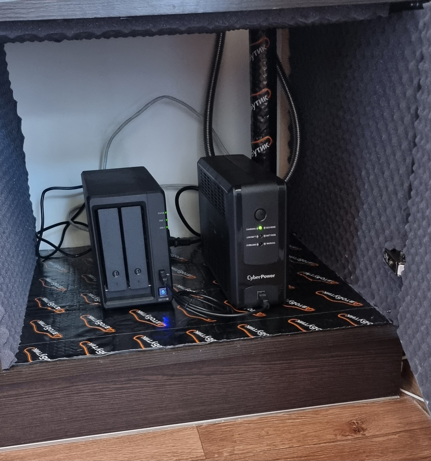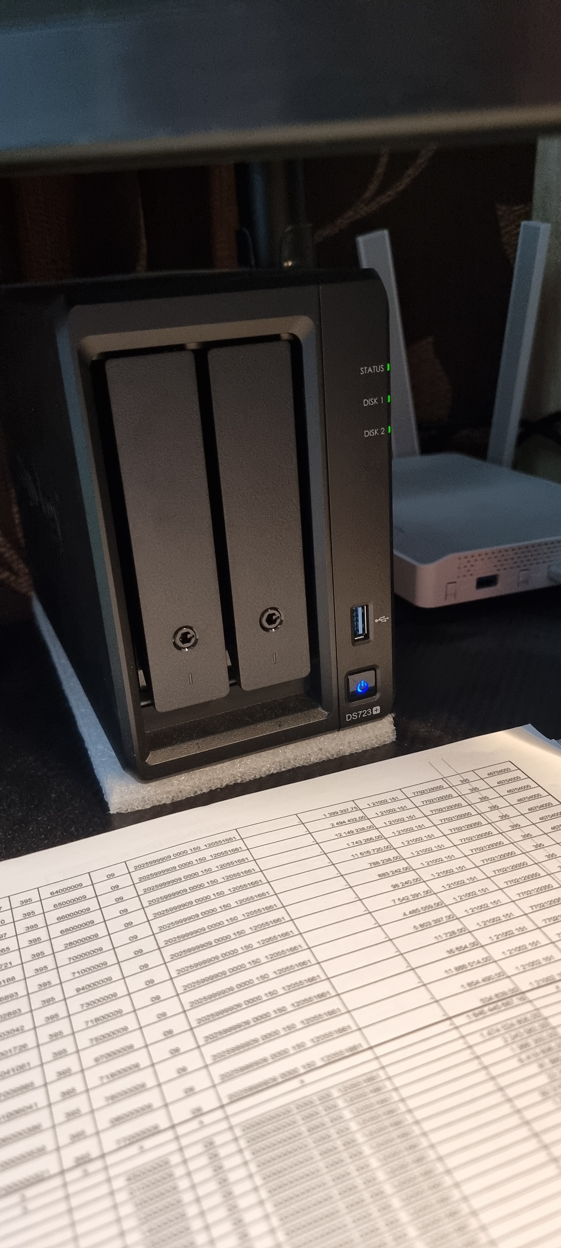 Стоял у меня NAS Synology DS723+ рядом с монитором. Считай слева в полуметре от меня. Был подключён к роутеру самыми короткими патчами. Все было ничего вроде. Но жёсткие уж больно щелкали. В спящий режим почему-то не переходил. Жёсткие такие WD RED PRO 14 GB. Куплены новыми за бесценок на смм.