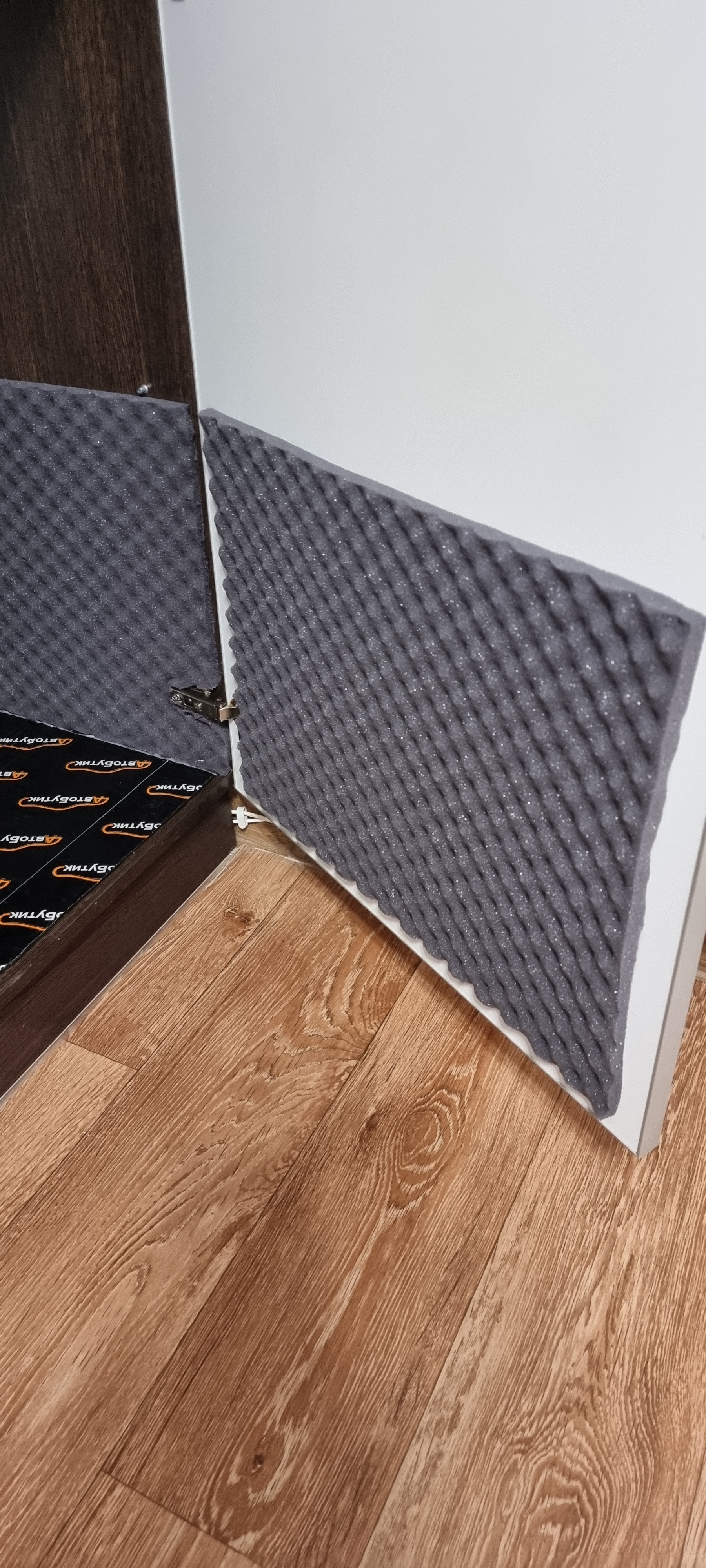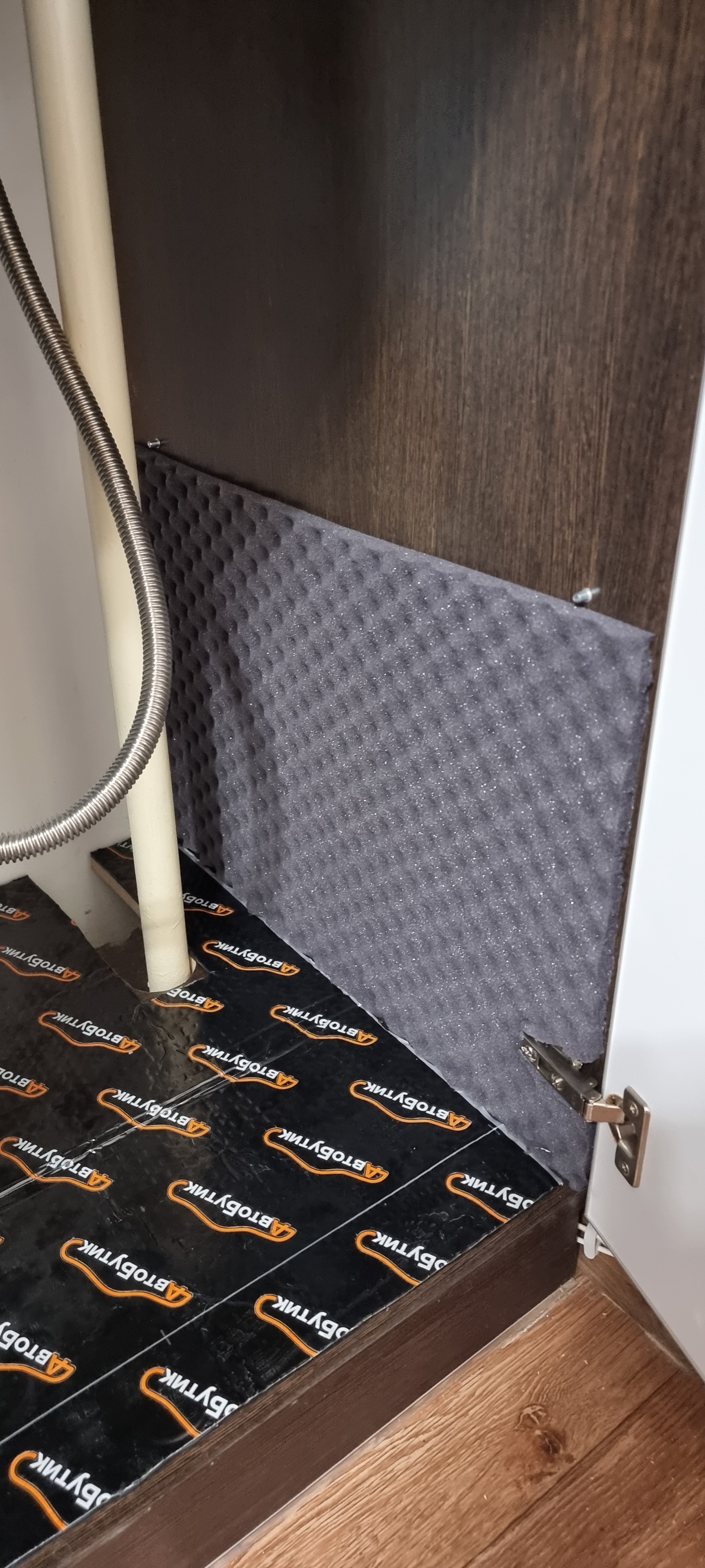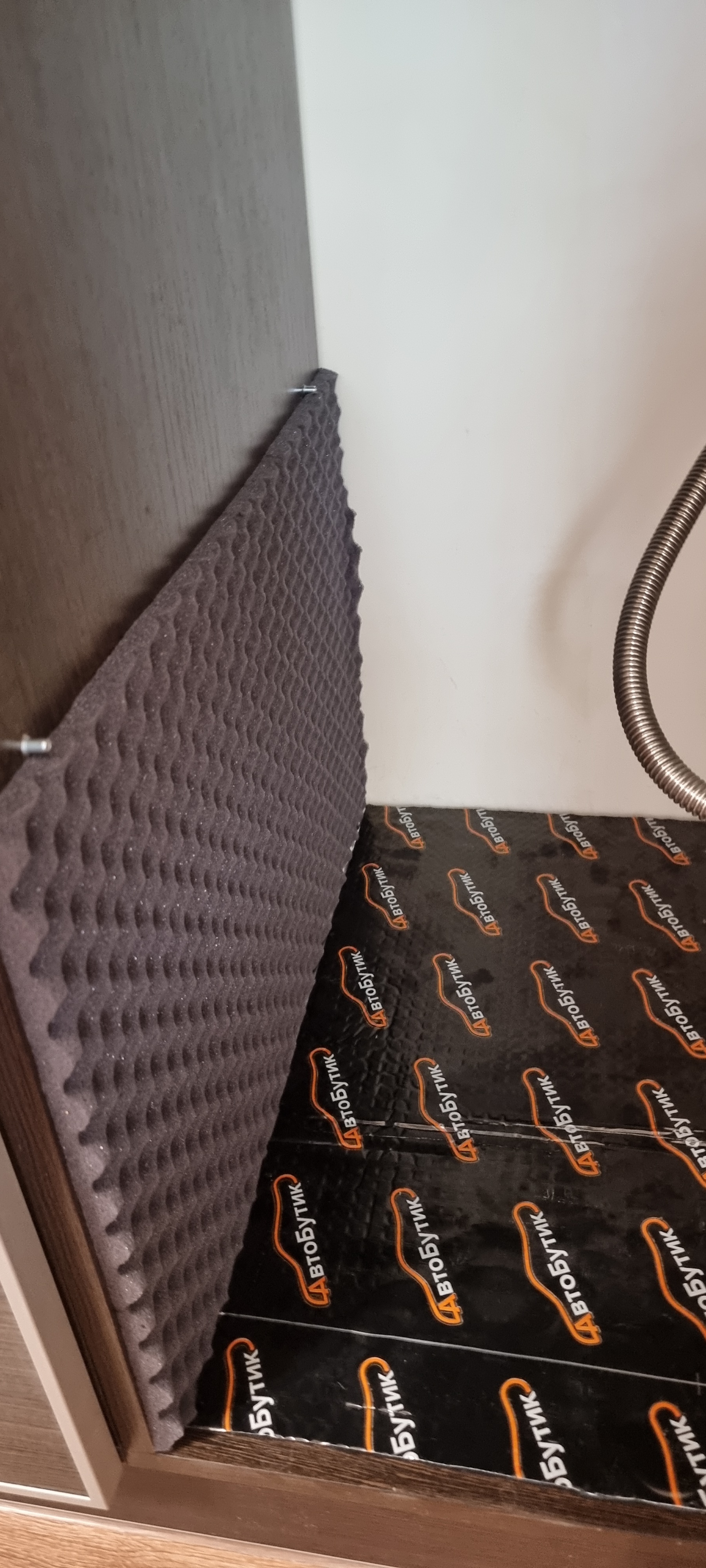 Почистил там все от пыли. Вырезал по размерам полки изоляцию и наклеил.