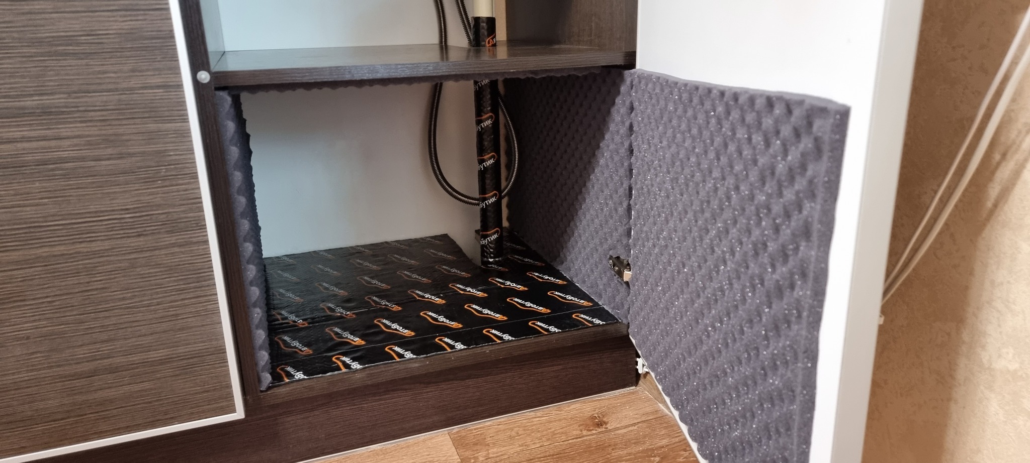 С закрытой дверцей из другой комнаты совсем не слышно. Но теперь надо чего-то делать с вентиляцией. С закрытой дверцей греются разумеется больше. Думаю насчёт дополнительных вентиляторов.
