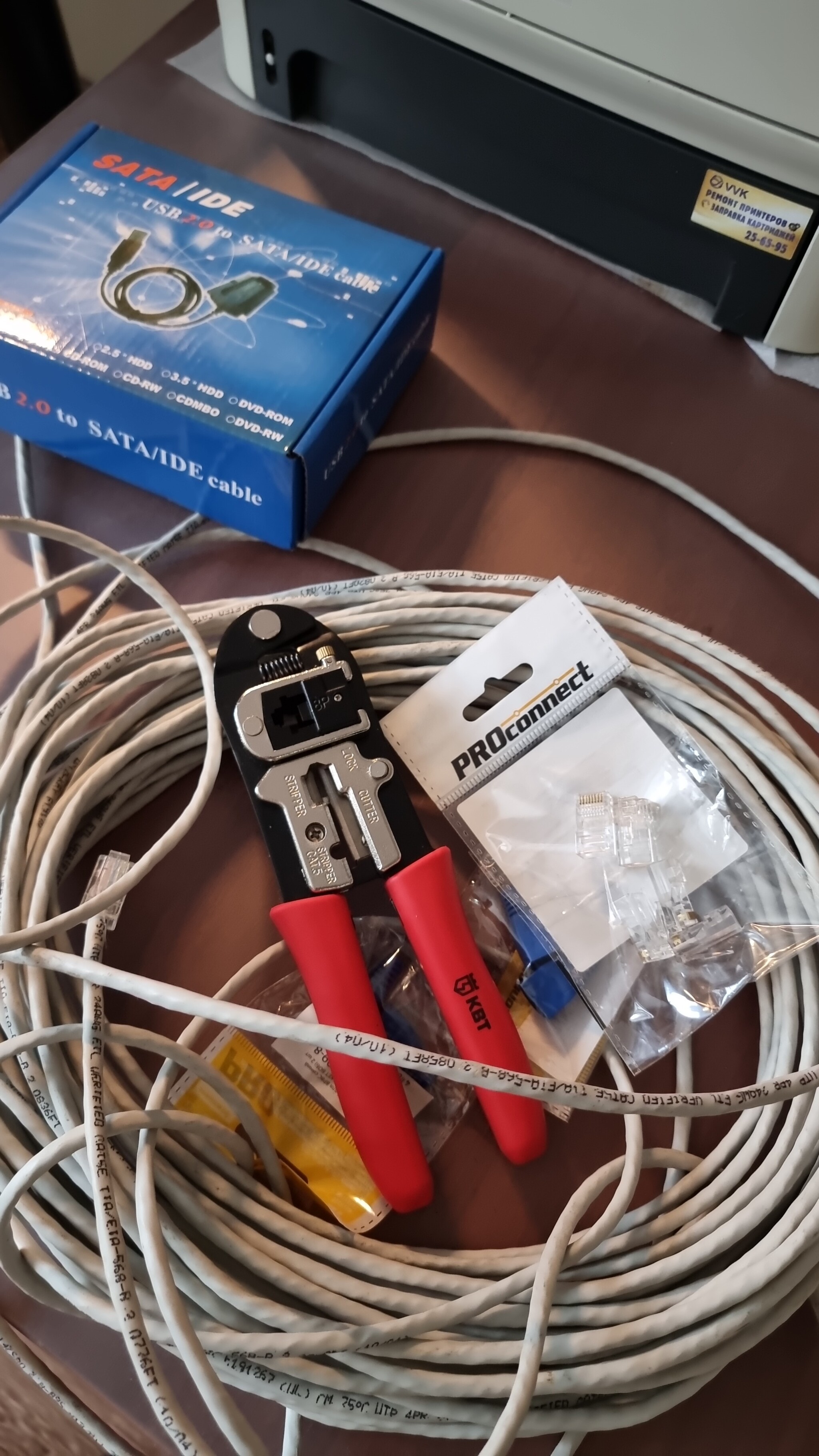 Теперь надо провести патчкорды. У меня их два. Создал бонд на два гигабита. Провод лежал давно, лет 10. Как друг админ сказал, был предназначен для первоначальной прокладки в стене. А вот коннекторы и кримпер.