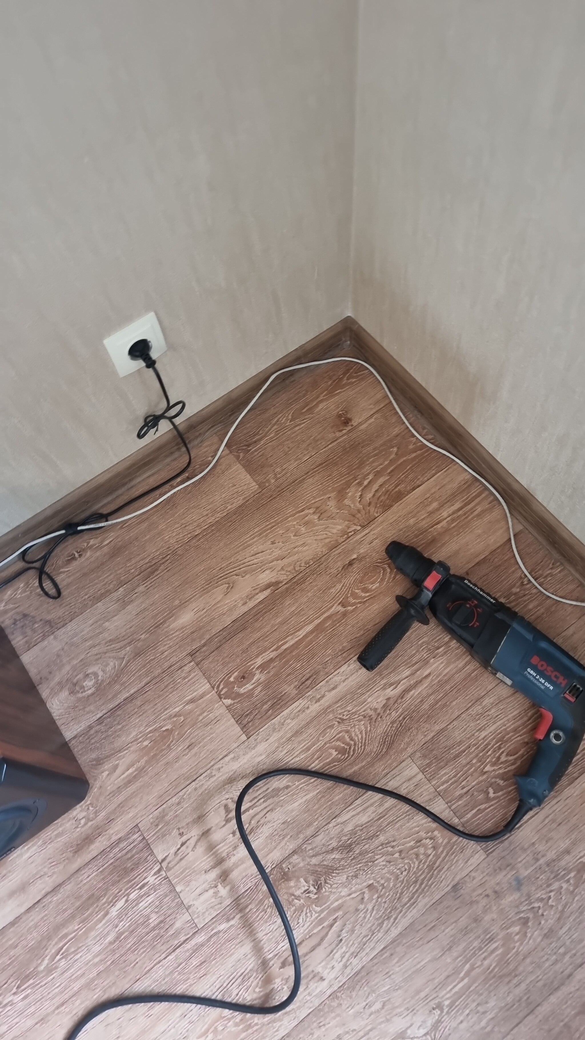 Вот там в углу, прям над плинтусом. Сам плинтус решил не снимать. Просверлил, один провод прошёл норм, а второй застрял. Судя по всему, внутри стены пустотелый кирпич. Завожу патч, а он скотина там в пустоте и сворачивается. Но я протащил с помощью тонкой спицы и изоленты. Фото этого забыл сделать. В итоге вот так:
