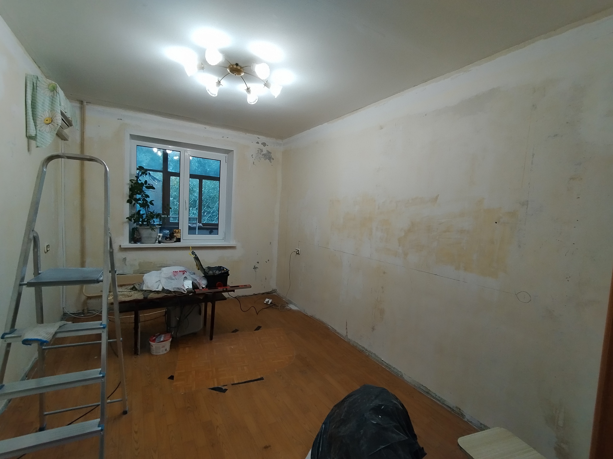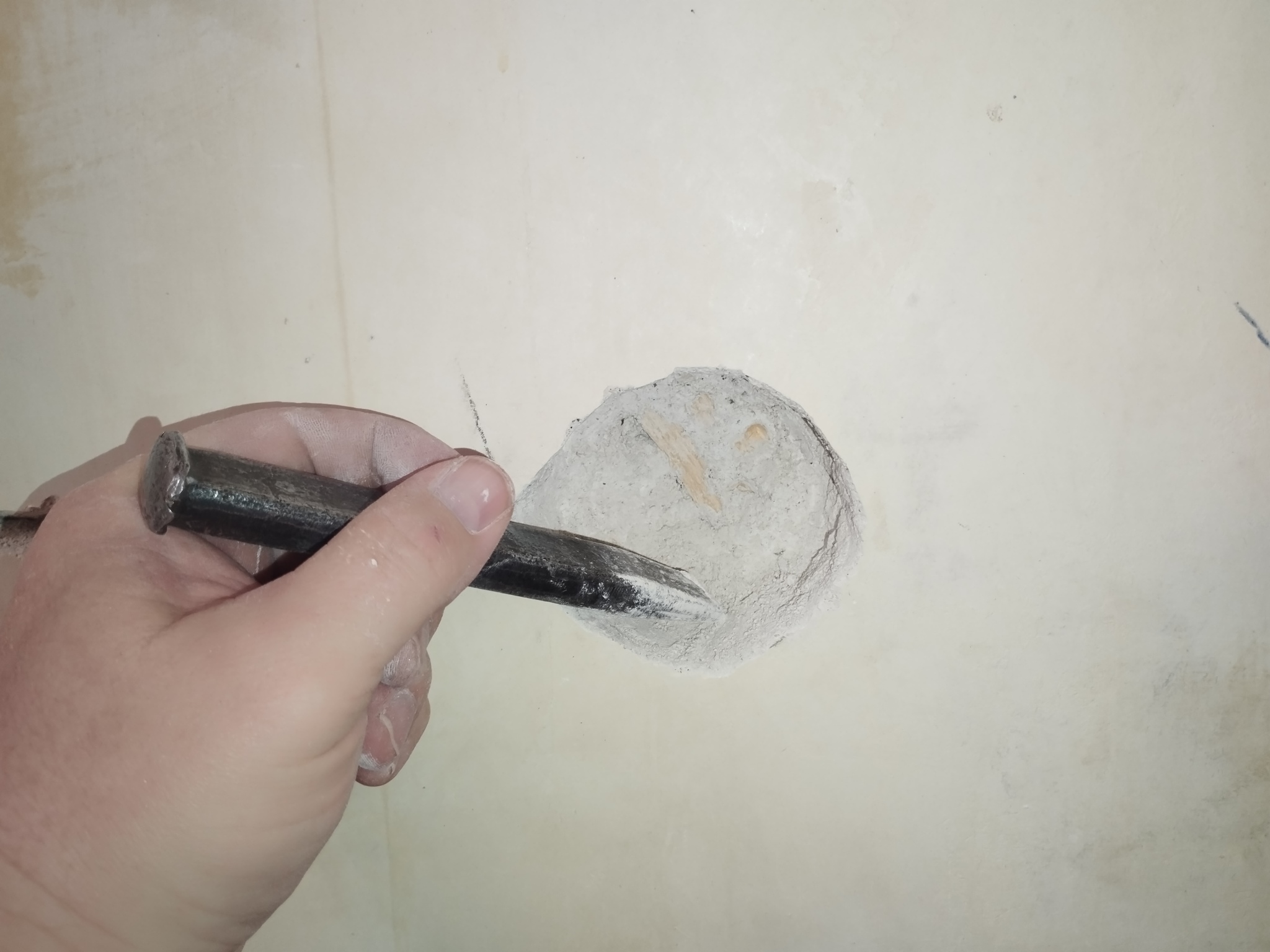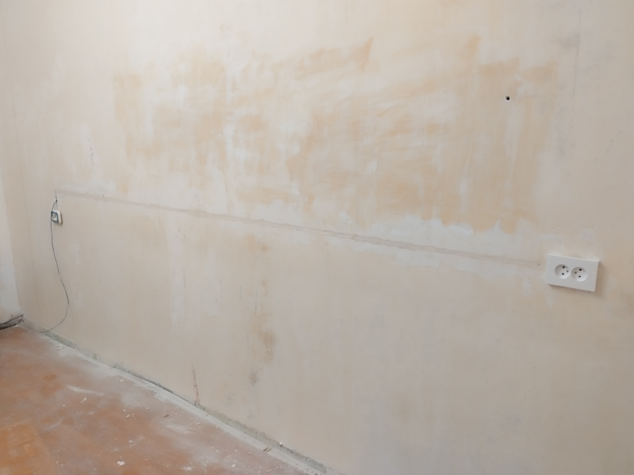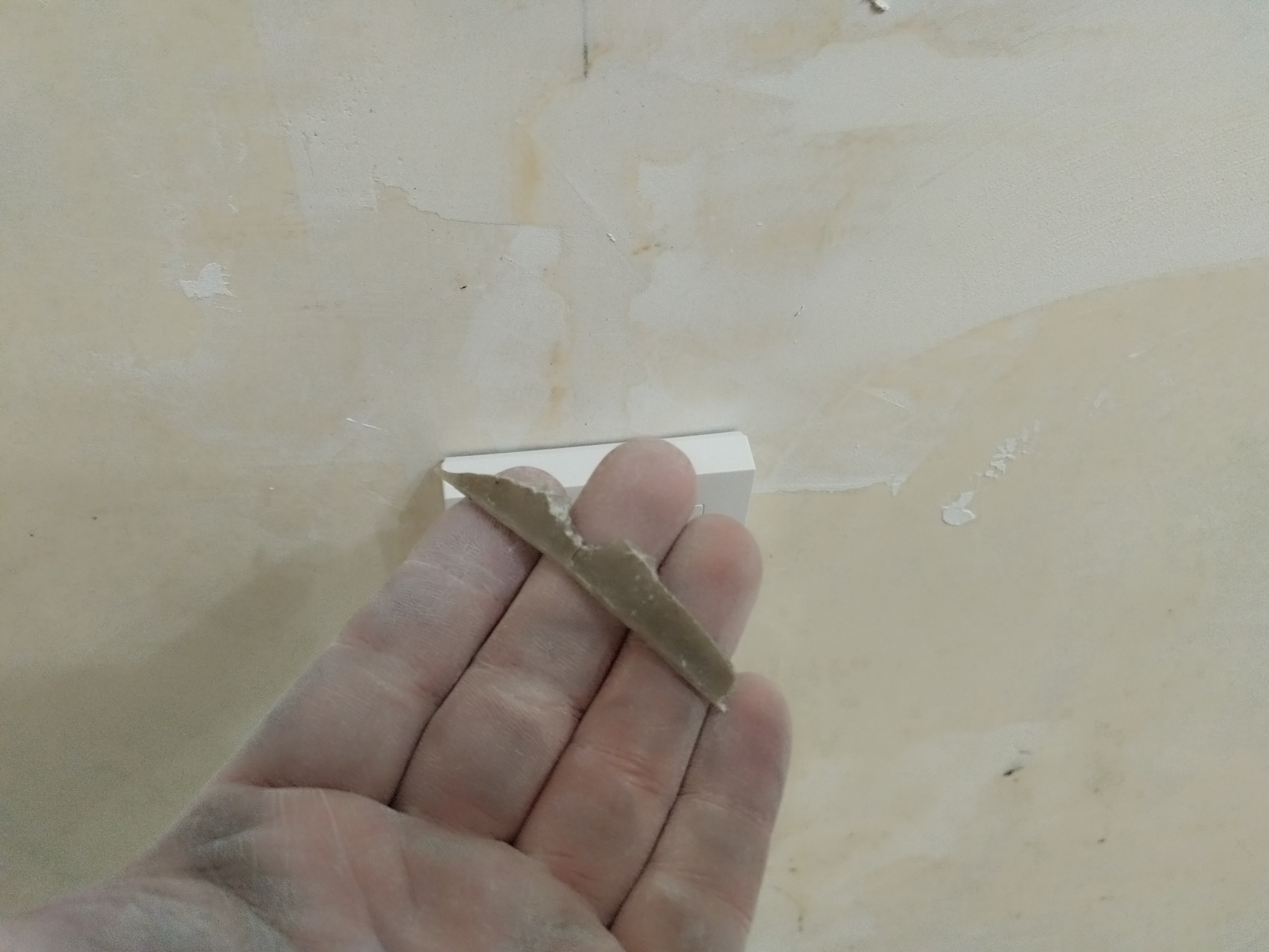 Стена с которой работаем мы с сыном межкомнатная, сделана из гипса.