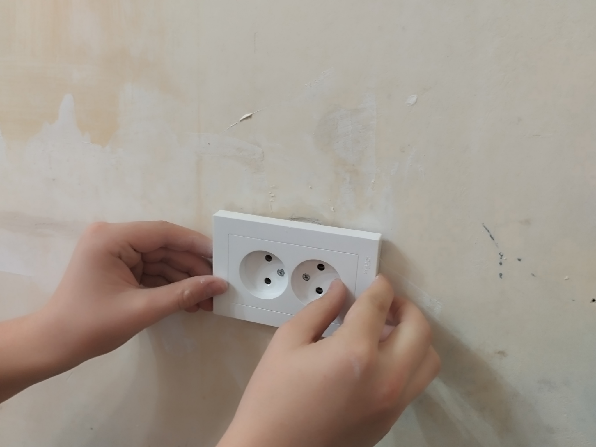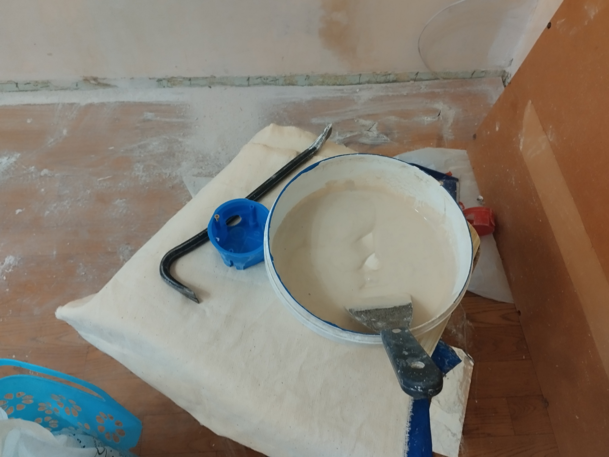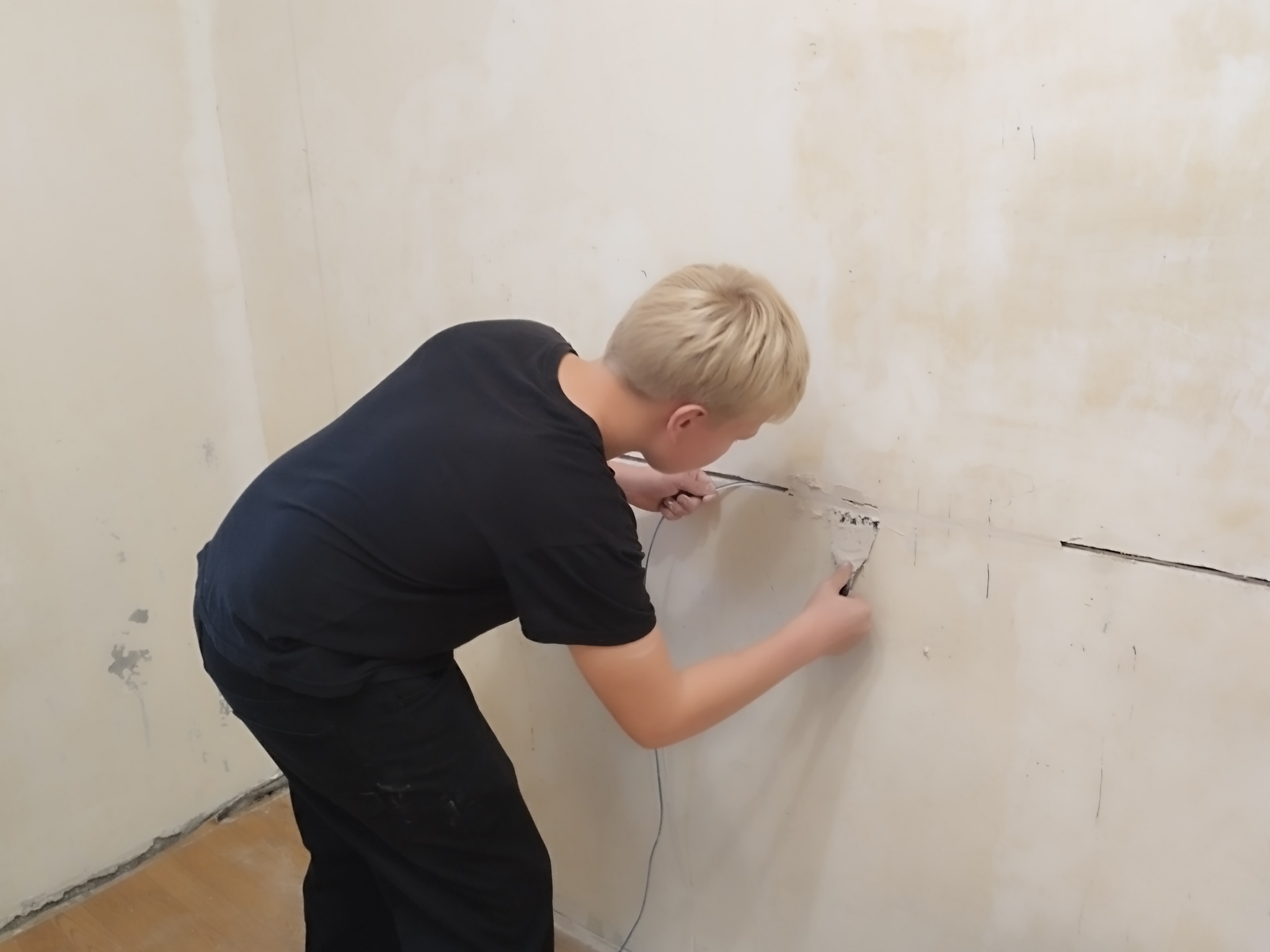 Сын работал с алебастром. Он укладывал в штробу провода и подмазывал их густеющим алебастром для фиксации проводов.