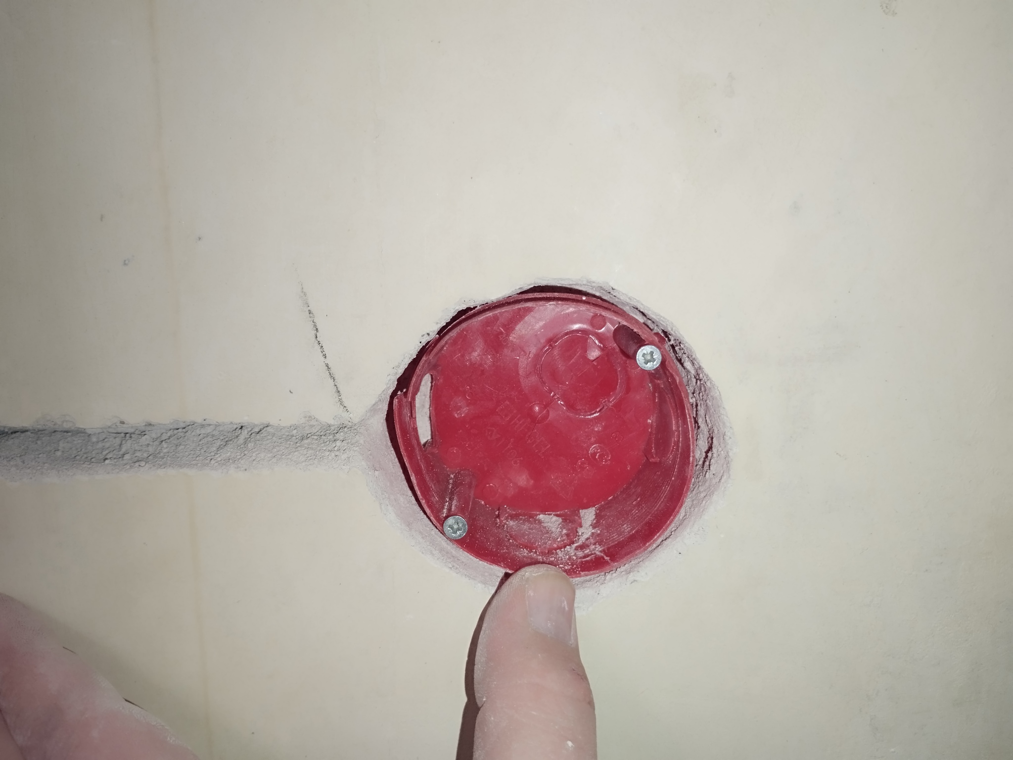 Обильно намазываю в нишу для подрозетника жидкий как майонез алебастр и вдавливаю в неё подразетник, чтобы края подрозетника были заподлицо со стеной. Из зазора вокруг подразетнтка вылезли излишки алибастра. Небольшим саморезом закрепил подразетник в нише.