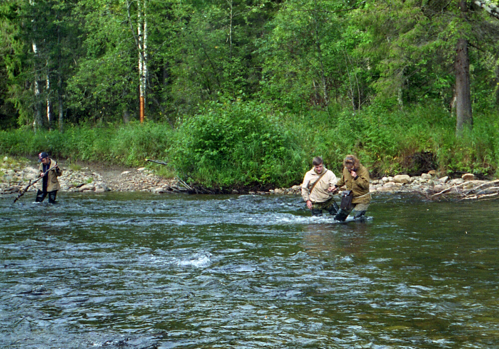 Ну что же, настала моя очередь набирать полные сапоги. Я подтянул ремни на сбруе магнитометра, чтобы он не болтался на мне во время переправы, спрятал поглубже пикетажку (не дай бог её потерять – вся работа насмарку), подобрал свой шест и зашёл в реку. Тугие струи воды тут же начали бить меня по ногам, пытаясь закружить, остановить, сбить с ног.