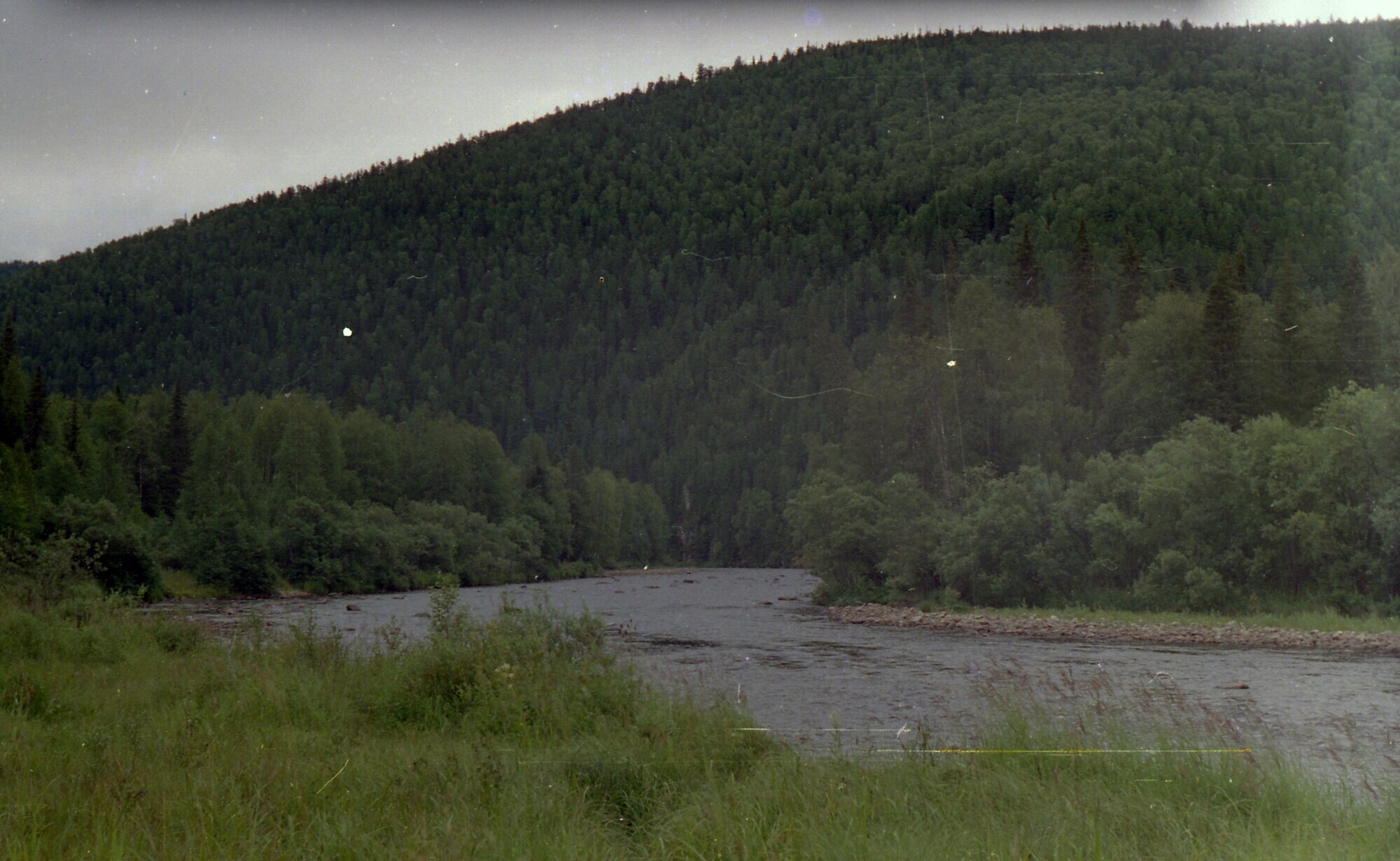 И вот я добрался до самого скверного места – до стремнины. При переходе я несколько сбился, и пошёл не там, где прошёл Костя, а несколько ниже, и это стало моей очень большой ошибкой. Практически через пару шагов я ушёл в воду по пояс: болотные сапоги моментально набрали воду, и теперь сидели на мне двумя пудовыми гирями. Ледяная вода обхватила меня и стала медленно заваливать на бок. Выпучив глаза и беззвучно шевеля губами, с берега на меня смотрел Константин Константинович. «Только бы магнитометр не замочить!» - думал я, медленно заваливаясь в реку. Пять метров! Всего пять метров отделяло меня от спасительного берега, но как их пройти! Упершись шестом в дно, я прыгнул. Прыжком назвать моё телодвижение было сложно, но я всё-таки хоть немножко, на каких-то десять- пятнадцать сантиметров, но продвинулся вперёд! И так, короткими прыжками, я и добрался до берега, где меня подхватил Костя и практически на руках вытащил из Кутима…