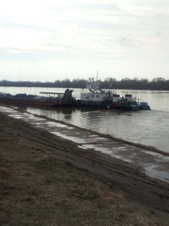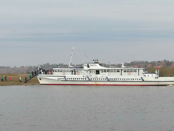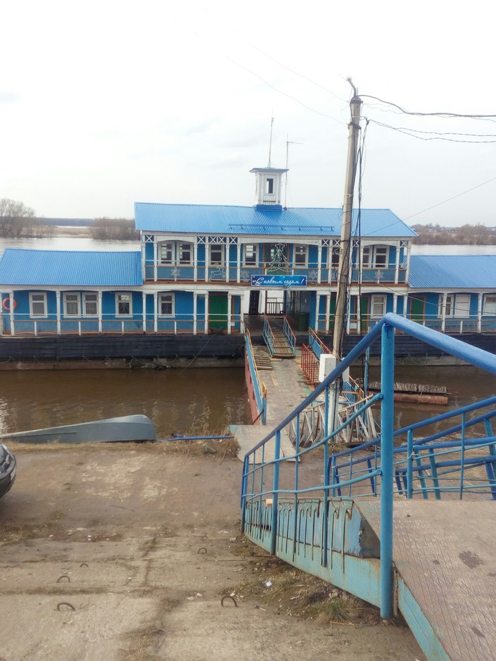Сейчас из-за разлива катер ходит не напрямую (5минут), а туда, где можно пристать, под деревню Большое Окское. А вот автобус на берег не приезжает, надо идти около 2 километров по лугам, где грязи по щиколотку.
