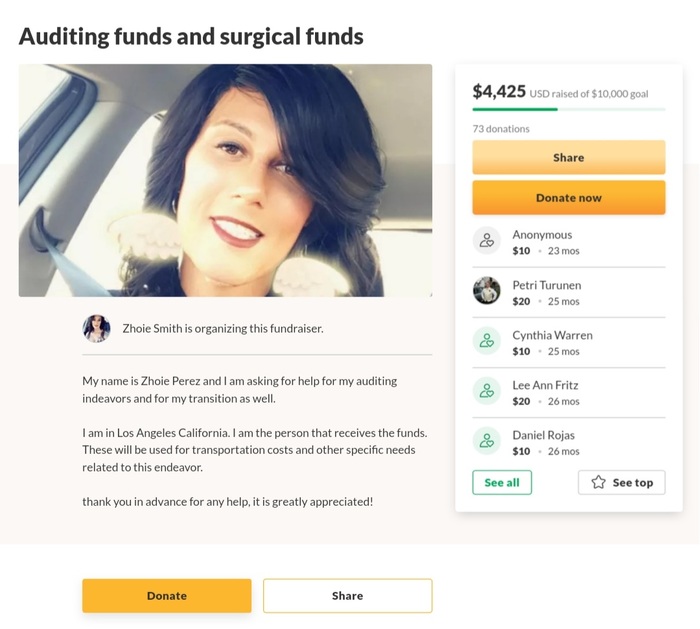 И наконец когда подписчиков набралось достаточно (до стрельбы их было в районе 17 тысяч) - Перес признался в своём желании поменять пол на женский и даже объявил на это сбор средств: