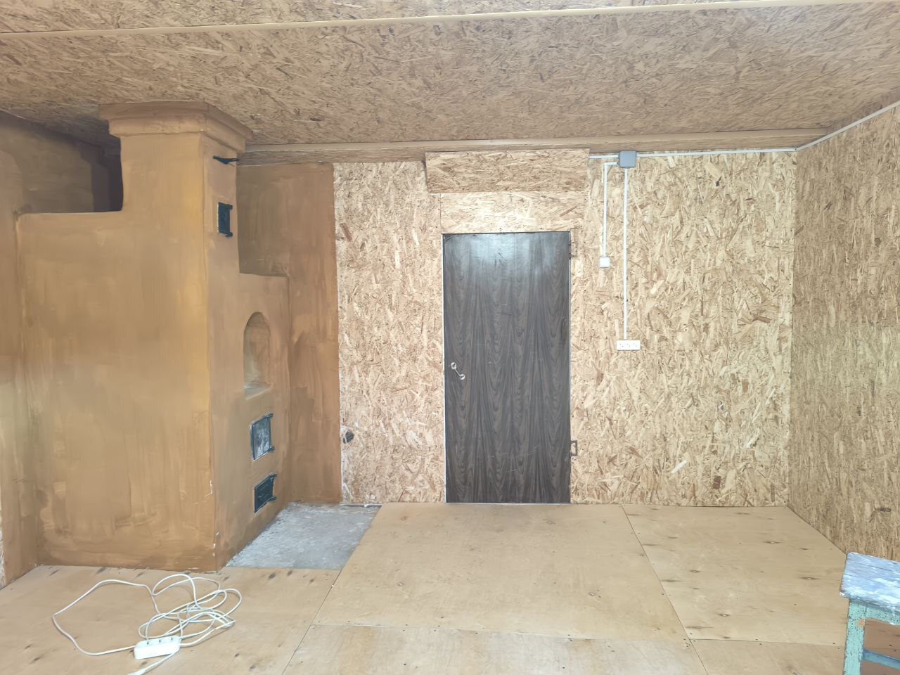 Начало октября: появился потолок и почти закончили обшивать стены.