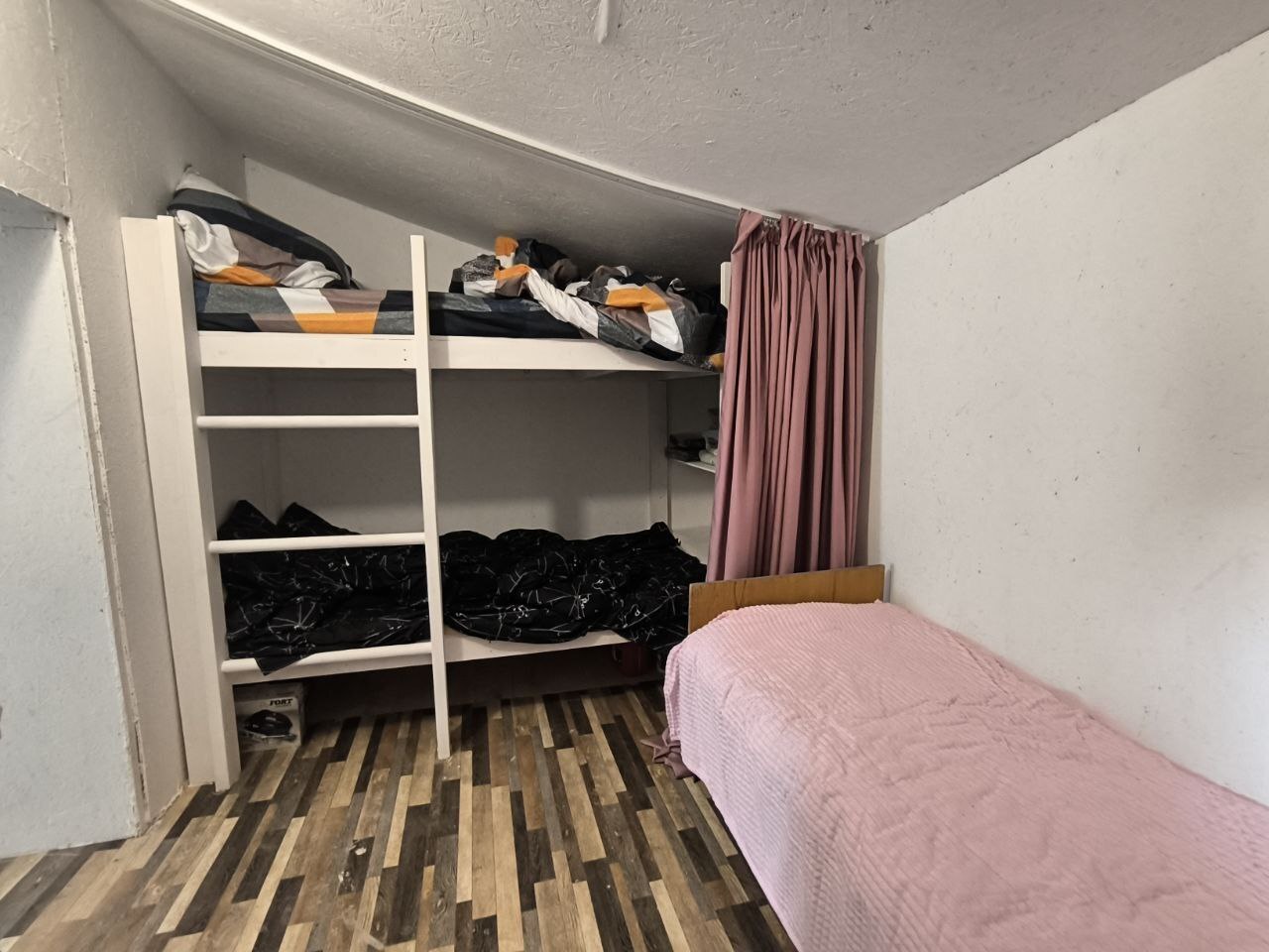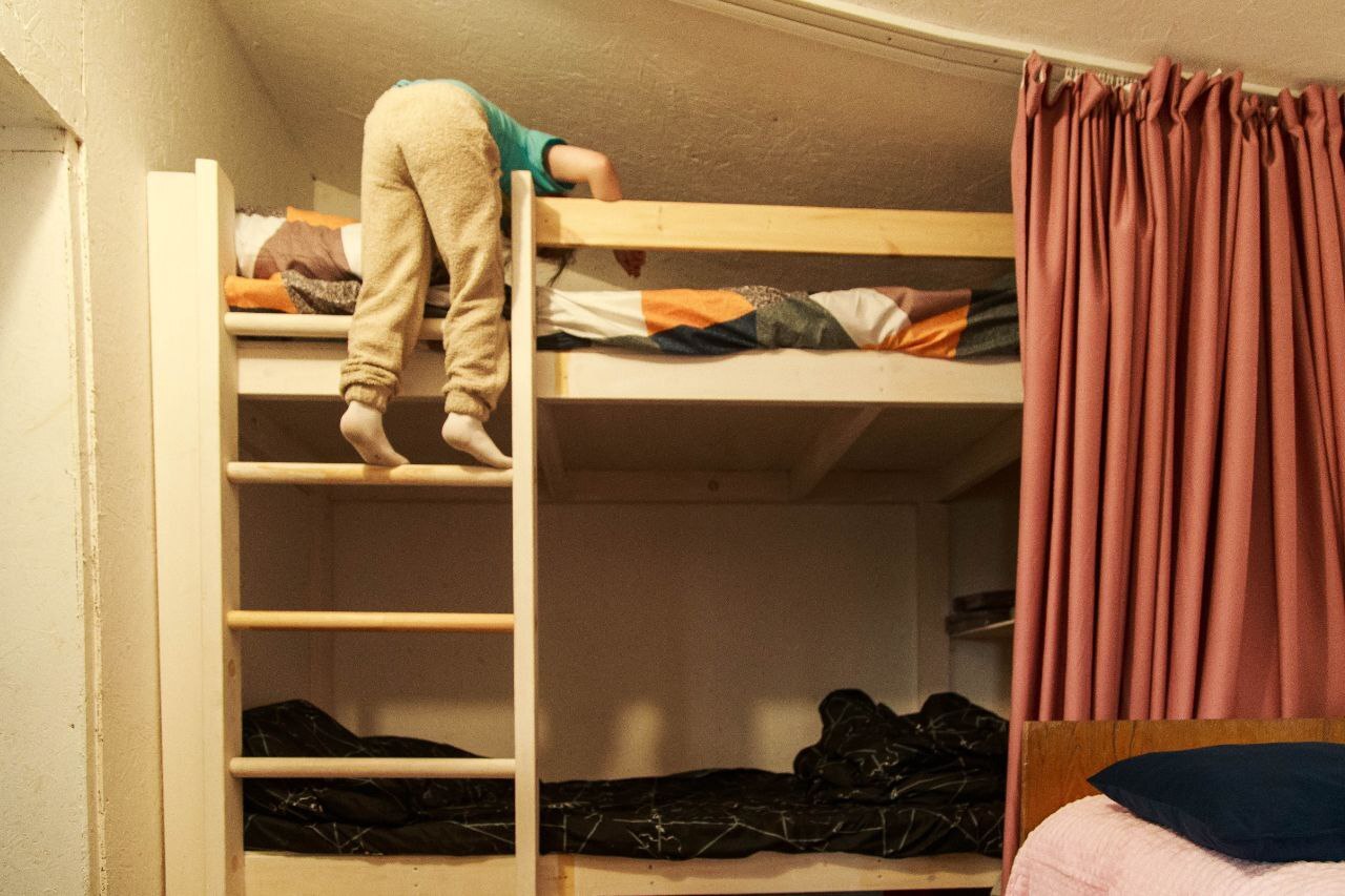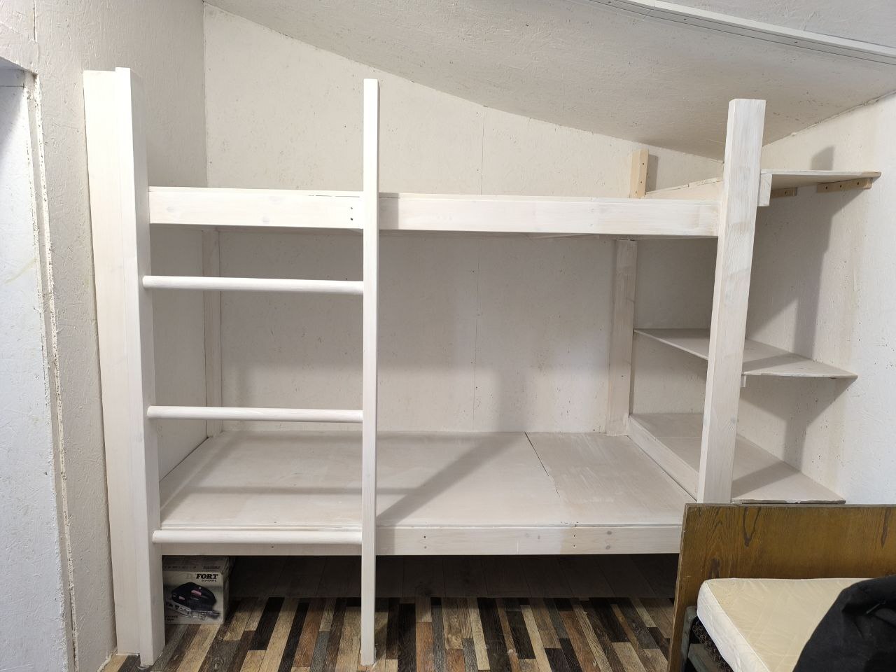 Чуть позже к кровати еще прицепили верхнюю перекладину, чтобы ночью никто не свалился сверху. И добавили несколько ступенек.