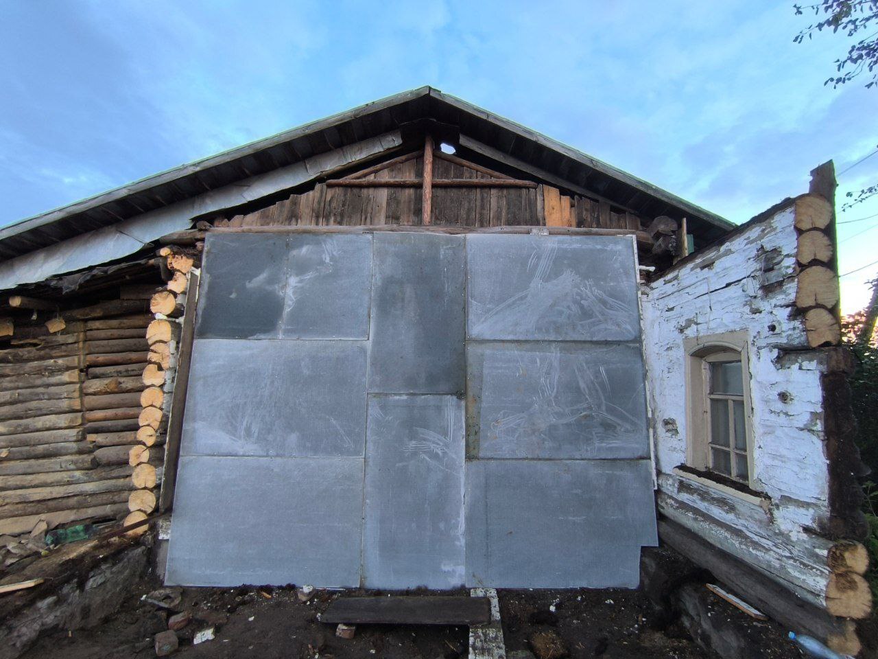 Снаружи: сносим сгнившую половину, поднимаем угол сеней. Зашиваем всю стену плоским шифером.