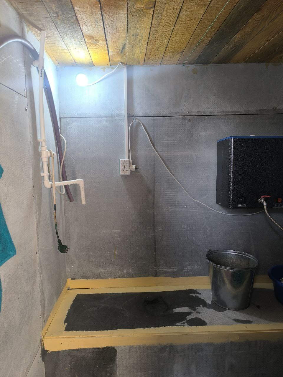 Еще немножко почесали в головах (хорошая мысля приходит опосля) и завели в душевую трубу с водой, чтобы не таскаться с ним туда-сюда. Поскольку это было внезапное озарение, и трубу заранее не купили, то поставили то, что нашли в сарае. Выглядит коряво, поэтому поставила себе в план переделать потом:
