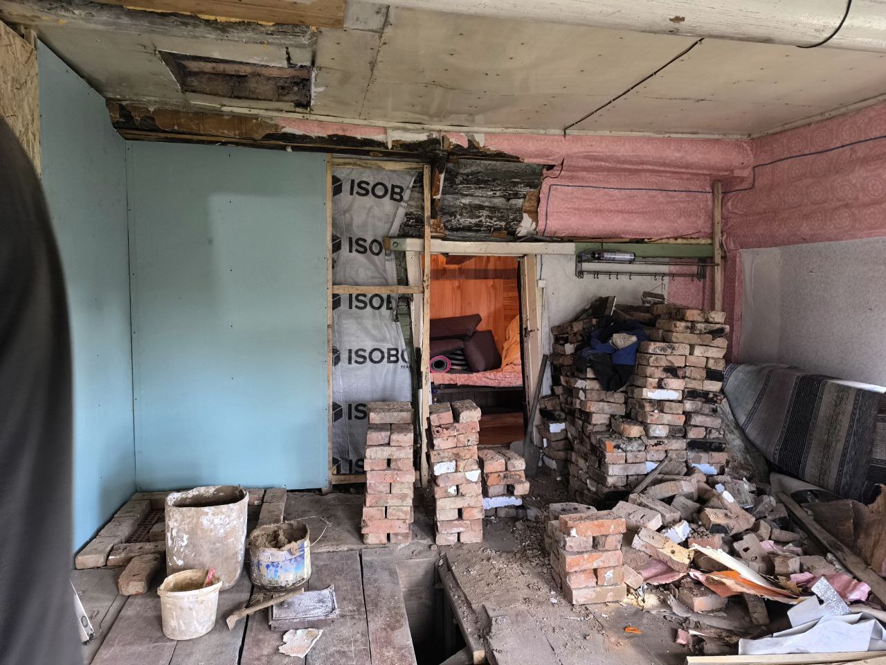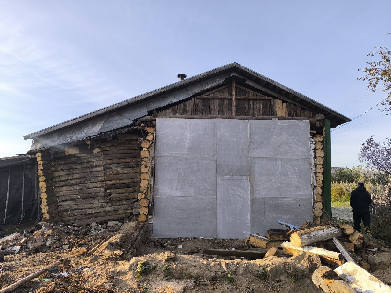 Электричество перенесли к жилой половине дома, а оставшуюся стенку от снесенной спилили: