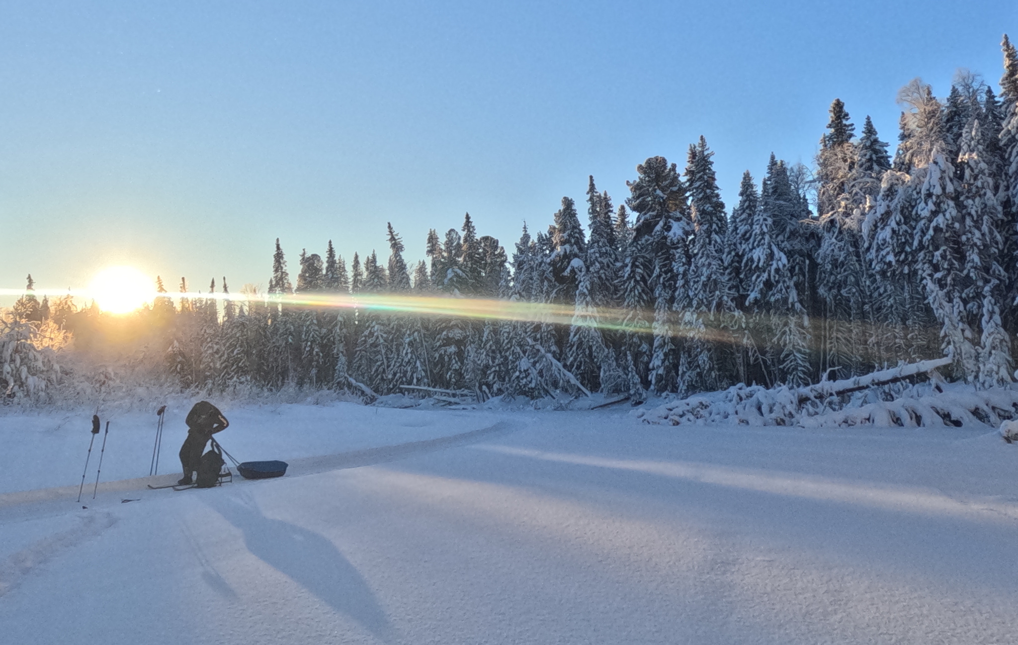 На Базе Ильича никого не было. Растопили печь, развесили всё сушиться. На следующий день сделали баню. Через пару дней за нами должен приехать забросчик чтобы забрать в цивилизацию. Можно было спокойно просто пожить в тайге. Других дел как заготовить дров у нас не было. В назначенный день и час снегоход не появился. Мы прождали ещё 3 часа. Поняли, что за нами никто не приедет. Что происходит было неизвестно. В 13 км от нас в сторону посёлка есть ещё одна база, на ней люди и связь. Собрались и пошли туда. На этот раз я решил идти в лёгких штанах без полукомбеза. Мороз покусывал ноги, но зато я мог идти, не останавливаясь и не потеть. Добежали быстро. На базе созвонились с забросчиком. Оказалось, что температура в этот день опустилась до -52 даже в посёлке (в предгорьях ещё холоднее) и снегоходы не завелись. Нас забрали только на следующий день.