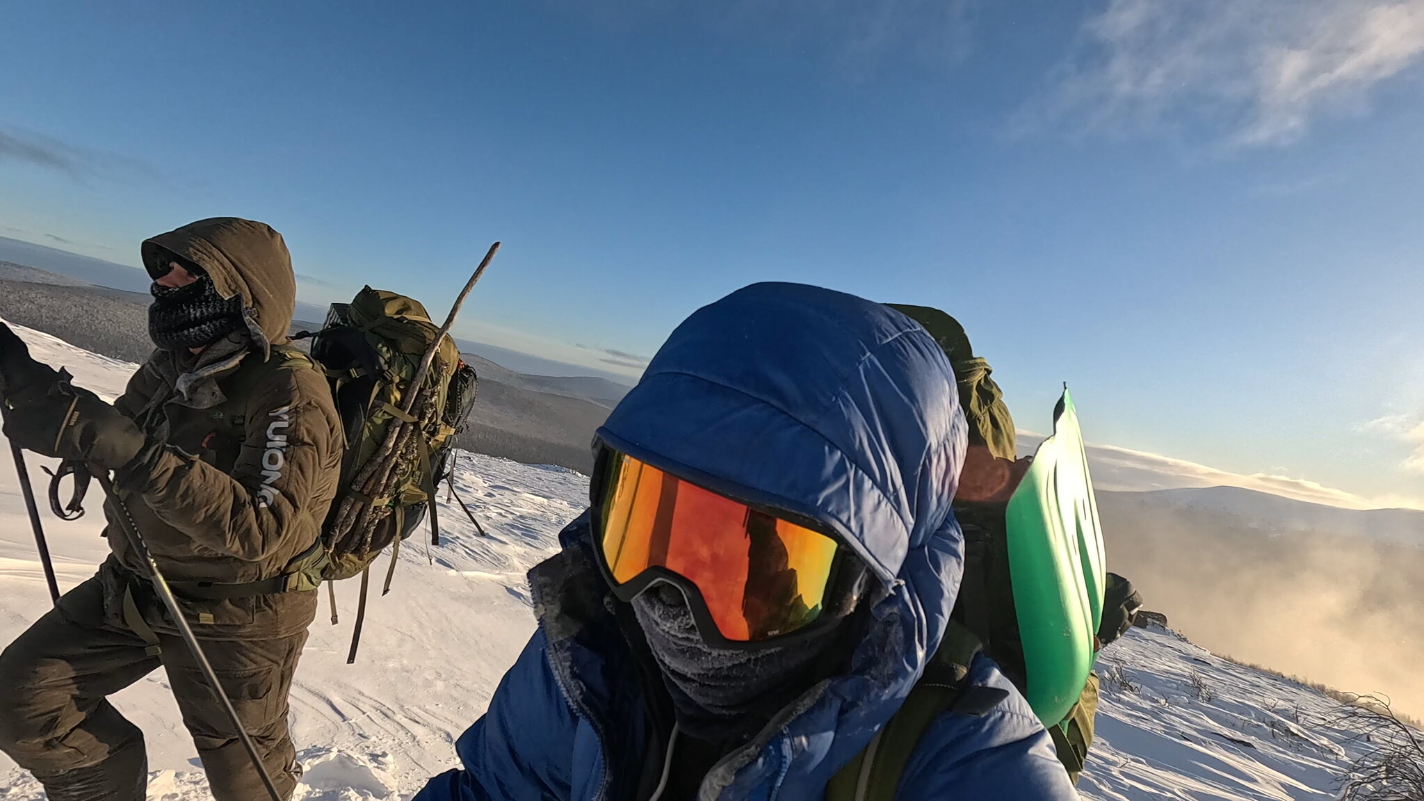Когда мы поднялись на «вершину» перевала, было относительно спокойно. Ветер присутствовал, но ничего критического. Колян предложил хлопнуть чаю, я решил, что надо строить снежную стену и ставить палатку, а там уже хлопнем. Это было максимально правильное решение. Мы нашли подходящее место – огромный валун, за которым было более-менее ровное пространство. Начали резать лопатой блоки из снега и складывать вокруг валуна. Когда стена была практически готова, ветер быстро усилился, и скоро перерос в ураганный. Стоять на ногах было сложно. Развернуться в сторону ветра и посмотреть было вовсе невозможно. Миллион летящих ледяных игл выжигали лицо и глаза. Я натянул вторую балаклаву. Очки постоянно запотевали, их хватало секунд на 20, пришлось работать без них. Когда стена была готова мы принялись ставить палатку. И хотя нас было двое, это была самая продолжительная сборка палатки за всю мою жизнь. Мы расставили её на все оттяжки. Оттяжки крепили на снеговые якоря. В якоря мы положили валуны, найденные и откопанные из-под снега. Пригодились и палки, которые я притащил из леса предвещая что нас ждёт. Буря ревела. Видимость была нулевая. На случай потери палатки из видимости, мы забили в навигаторы её координаты. Потеряться можно, даже просто отойдя на несколько метров по нужде. Снег циркулировал в закрытой палатке как в рождественском шаре. После постройки снежной стены я прилично пропотел свою одежду. Термуха была мокрая, хоть выжимай. Я достал каталитическую грелку. Зажег её и положил в спальник. Поработав секунд двадцать, она потухла. Попробовал повторить затею, подольше отогревая её в руках. Результат повторился. Керосиновая грелка категорически отказывалась работать, ей было холодно. Мы сделали ужин, поели и решили спать. Несколько часов было зябко, тело активно пыталось высушить одежду. Ближе к полуночи я почувствовал, что одежда на мне почти высохла и я провалился в сон.