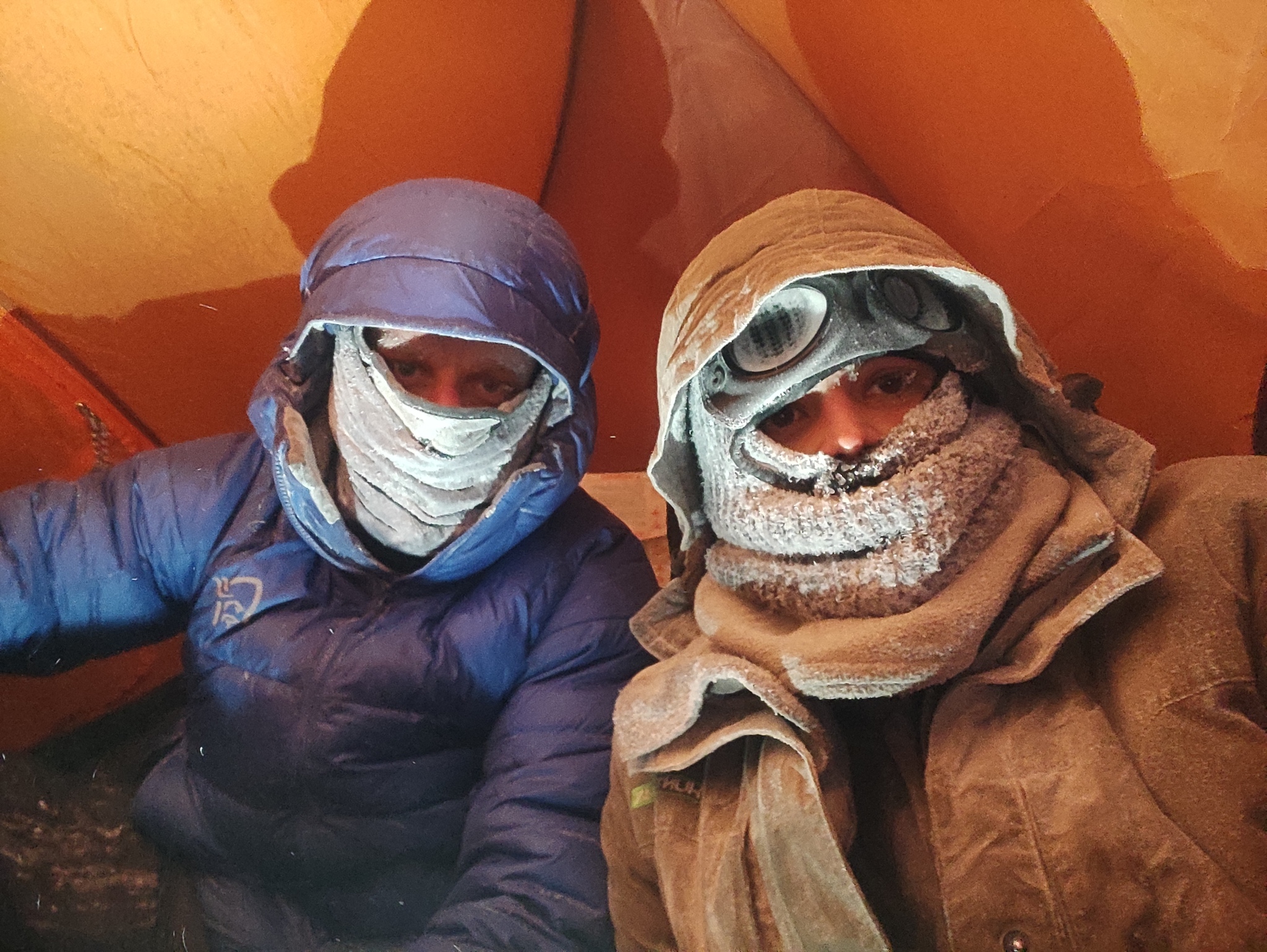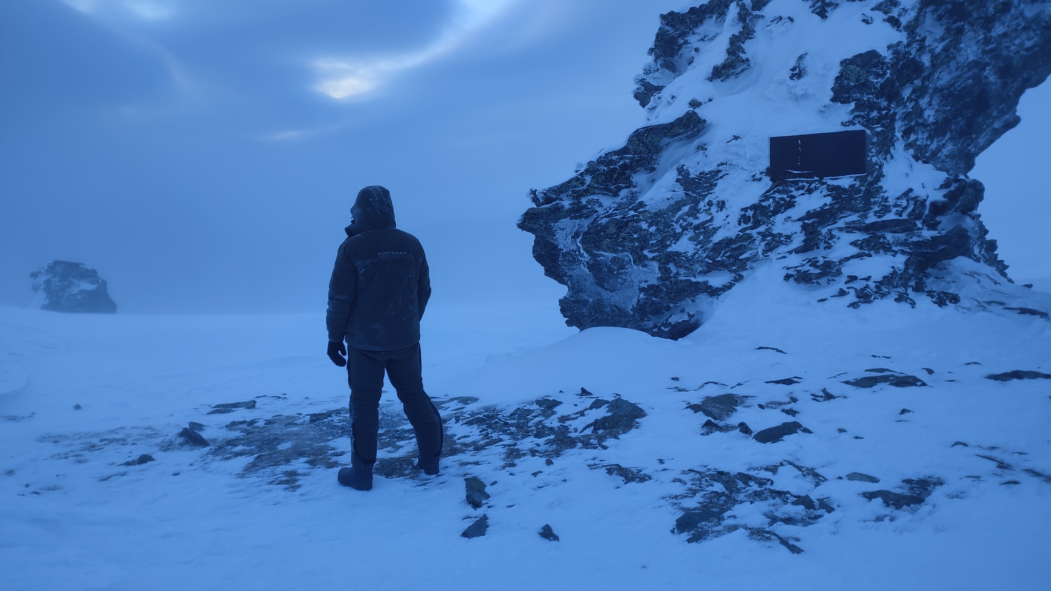 На утро я проснулся под небольшим слоем снега, который наконец успокоился и осел внутри палатки. Он покрыл все вещи. Рюкзаки в тамбурах были покрыты приличным слоем и только некоторые их части виднелись из-под снега. С огромным трудом мы пересилили себя, наполовину выползли из спальников, начали разбирать вещи, готовить завтрак. В этот момент хотелось отказаться от всего и просто остаться тут, уснуть под валуном вечным сном, пока не найдут, заодно придумав загадочных историй. Перетрясли вещи, погода более-менее стабилизировалась. Ветер стал добрее. Пошли к обелиску, посвященному памяти погибшей группы. Пока шли ветер успел два раза усилиться и ослабеть. Вообще заметил, что он тут очень часто и быстро изменяется. От почти полного штиля до крепкого ветерка с порывами до 20 метров может пройти всего минут пять-десять. Сделали фото у обелиска и пошарились вокруг, где возможно могла стоять палатка группы. К этому времени ветер снова усилился до постоянного потока в ~20-25 м/с. Очевидно, что на Отортен нас не пускают, да и даже на вершину Хочатчахль (Гора Мертвецов), у подножия которой мы стоим, нам не подняться. Ветер встречный и усиливается. Мой охотничий костюм со вставками, рассчитанный на -45 отлично справляется с ветром. Пуховик Коляна начинает продувать.