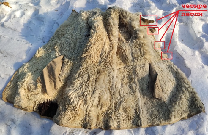 Но вскоре обычно появляются более грамотные сторонники карманной версии. Они говорят, что на фото не тулуп, а полушубок (бекеша) и что на фото это не карман тулупа с рукавицами, а карман полушубка. Действительно, по ГОСТ 7416-35 ПОЛУШУБКИ ОВЧИННЫЕ (БЕКЕШИ) у полушубка имеются два кармана. Но читая внимательно далее этот ГОСТ, мы узнаем, что у полушубка наверху четыре петли для пуговиц, а тип воротника - отложной (почти как у пальто). Смотрим снова на представленный выше рисунок 2 и видим на лежащем на снегу тулупе там только две петли и не видим совсем отложного воротника. К тому же тут же возникает вопрос — а где же второй карман полушубка (бекеши) ? Он должен быть на таком же расстоянии от края полога, как и первый якобы карман, а там пусто, ничего нет, а бекеши с одним карманом не бывает. Для примера смотрим на рисунок 1 и видим во всей красе бекешу на стоящем слева в последнем ряду военнослужащем. Руки он засунул в карманы, видны наверху три пуговицы, естественно с петлями. Четвертую пуговицу и петлю по ГОСТу скрывает тот самый отложной воротник. Все это еще раз нас убеждает, что на снегу лежит именно тулуп, а не бекеша. Но в этой ситуации будет еще лучше, если все читатели сами увидят полушубок (бекешу) со своими карманами на снегу, развернутый так, как на знаменитой фотографии на рисунке 1. Смотрим с удовольствием на карманы такой бекеши на рисунке 3.