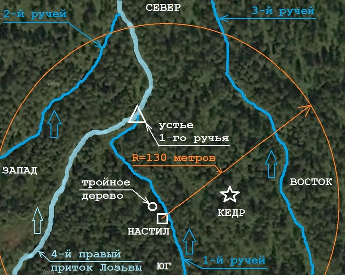 А что бы читатель лучше ориентировался на карте, нанесли на нее дополнительно кедр, настил, тройное дерево и устье первого ручья. Проводим на карте окружность радиусом 130 метров из центра, расположенного в настиле и видим, что внутри нее оказываются часть первого, второго и третьего ручья, а так же часть четвертого правого притока реки Лозьва. Из анализа фото на рисунке 1 , мы выявили первый характерный признак места расположения плотины, а именно то, что два невысоких, но крутых берега ручья подходят друг к другу на близкое расстояние, а именно на три метра. По этому признаку смотрим на часть первого ручья, попавшего в радиус 130 метров. Мы знаем из фотографий поисковиков, что этот ручей в то время весь был под снегом и берега довольно пологие и следовательно не похож на фото на рисунке 1. Да и летние фото и видео этого ручья уже туристов более позднего времени не показывают на нем таких близко стоящих крутых берегов. Вывод — плотина не стоит на первом ручье по первому признаку. Далее смотрим на часть 4-го правого притока, как он выглядел в