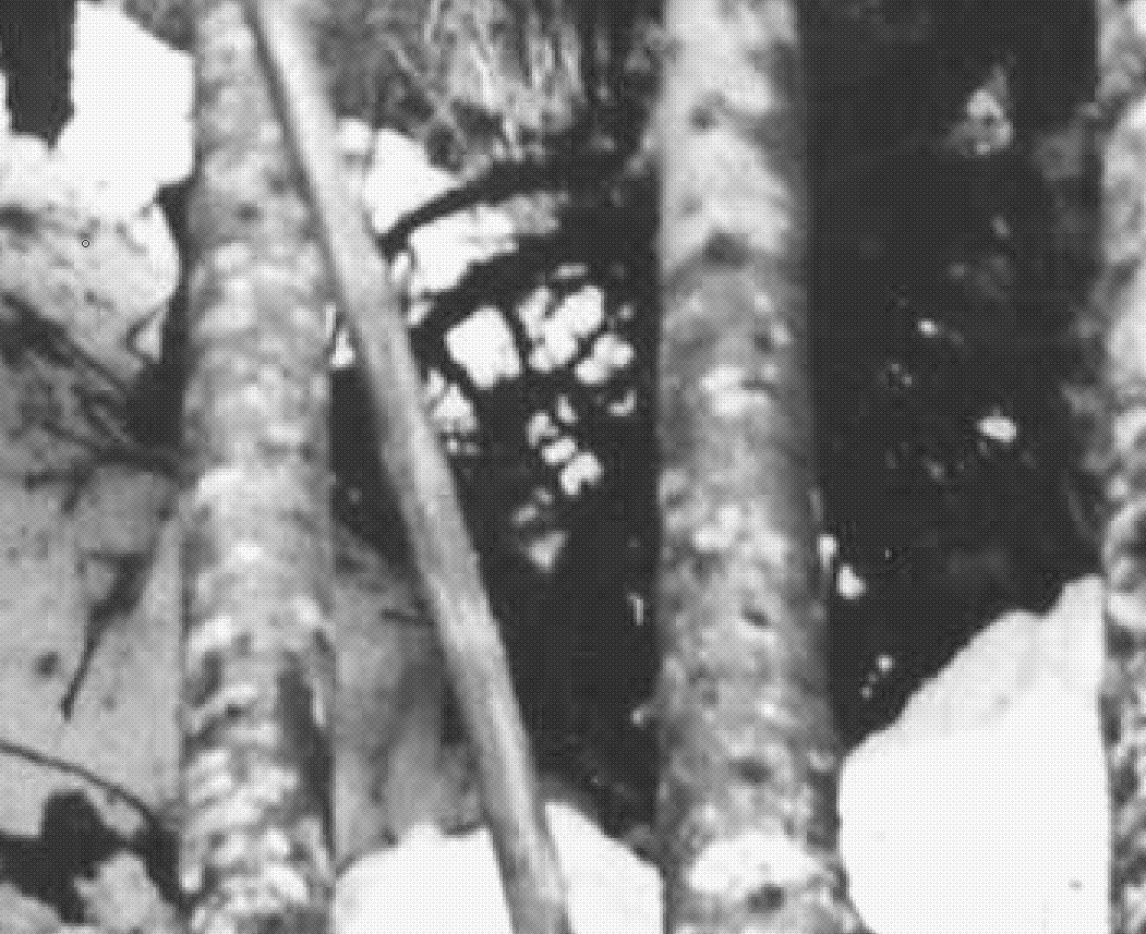 Для этого смотрим в начале внимательно на фото на рисунке 1, которое предположительно сделал всем известный поисковик Мохов 30 апреля 1959 года. На ней мы видим, что плотина построена над ручьем (сам ручей хорошо виден на двух других фотографиях этого сооружения, здесь эти фото не показанны), где поперек него брошен ствол мощного кедра, диаметром примерно 40 сантиметров. На этот ствол опираются шесть березовых бревен, для их надежной установки на стволе кедра топором вырублены зарубки, так же дополнительно закрепили их большими гвоздями. У этого кедра есть одна особенность, срублены ветки только у него в середине, над ручьем. Ветки на макушке и нижней части кедра не срублены, то есть ствол кедра лежит не на земле, а опирается на эти ветки. Снега над самим ручьем нет, только справа виден большой сугроб, другой берег почти без снега.