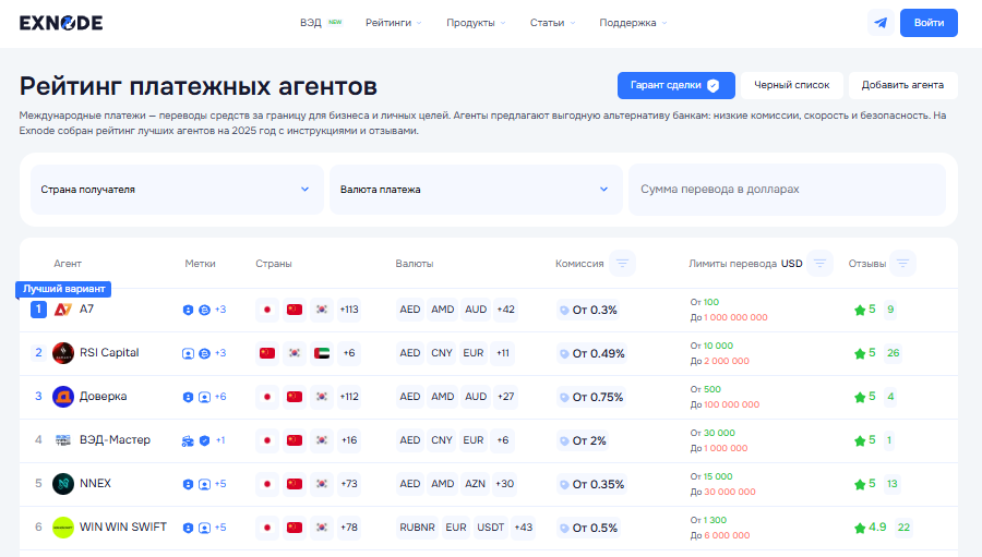 Сейчас для физических и юридических лиц доступны сразу несколько решений — от банков до платёжных агентов. Каждый способ имеет свои особенности, комиссии и лимиты. Но отметим, что платежные агенты выигрывают за счет низкой комиссии и высокой скорости перевода. Подобрать таких посредников можно на платформе Exnode.