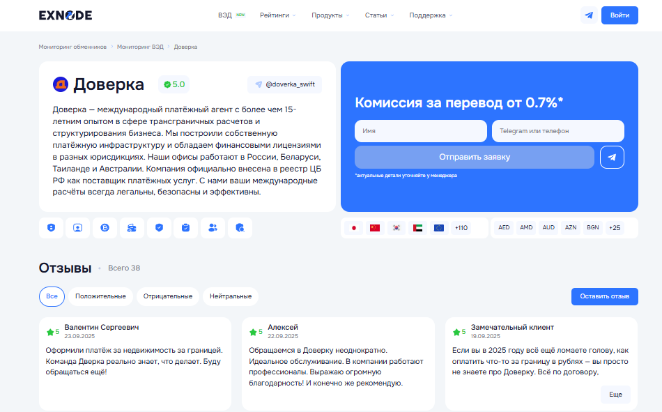 Агент «Доверка» — универсальное решение, особенно если нужно объединять переводы, возвраты экспортной выручки и расчёты по инвойсам. Он действует в разных юрисдикциях и имеет опыт работы по формальным каналам.