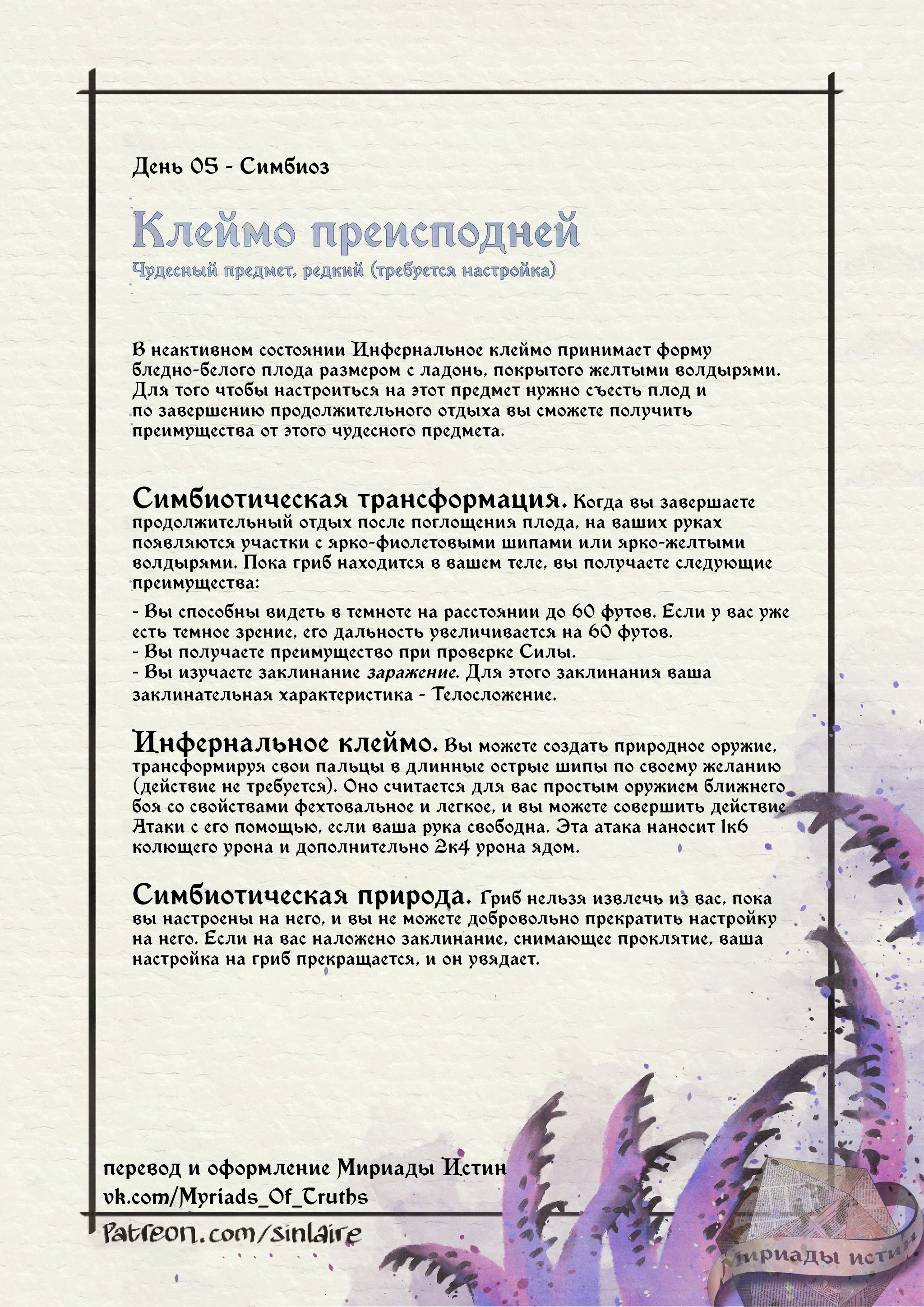 Tartarus tenaculi - разновидность волшебного растения, также известного как гриб Жуткая липучка (Eldritch Grasp). Съев этот плод, вы получаете силу и уникальные способности. Но согласитесь ли вы поставить на себе Клеймо преисподней?