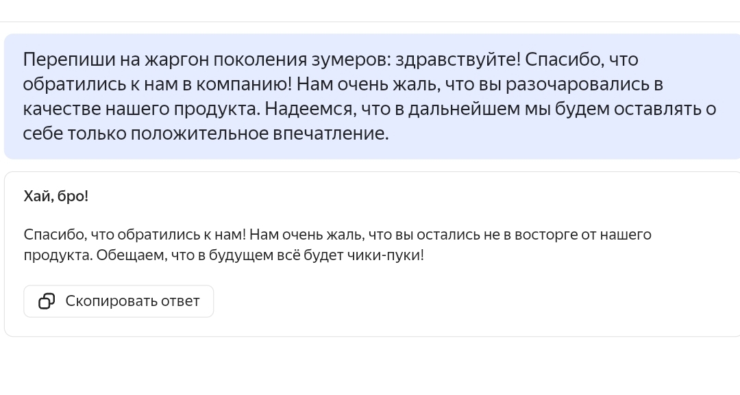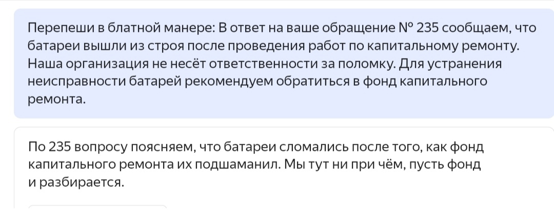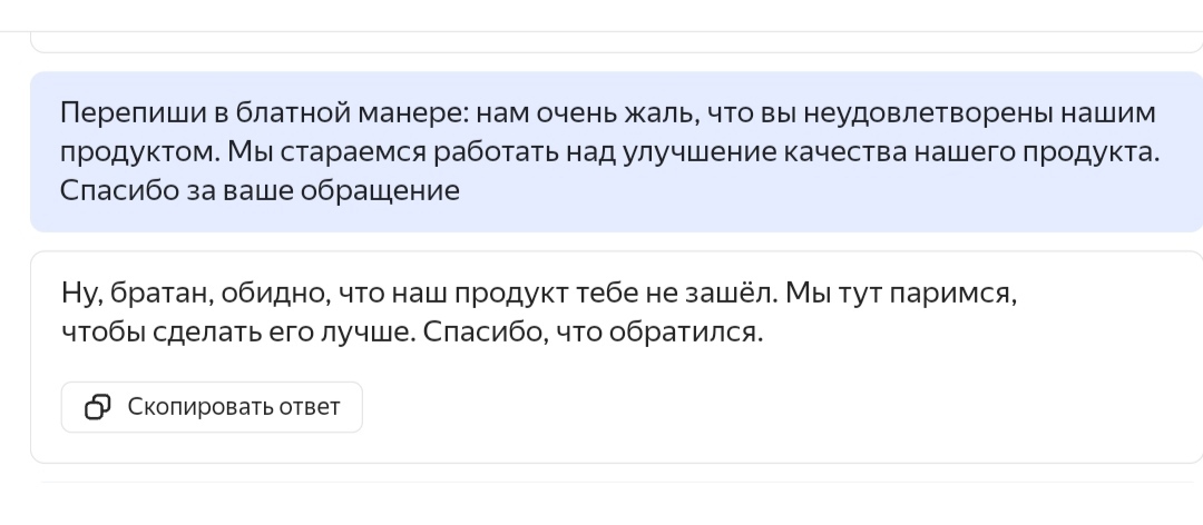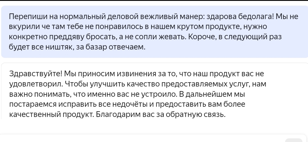 Затестил новый ИИ от Яндекса. Получается забавно. Вначале решил попробовать переписать гипотетический ответ на обращение в блатной манере.