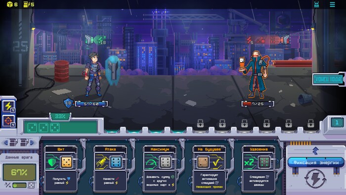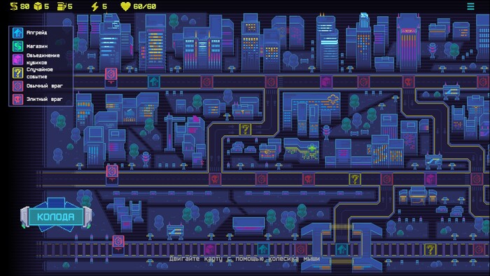 Сюжет здесь не важен. Он есть, но игра не заостряет на нём внимания. После обучения нас сразу отправляют в путешествие по глобальной карте. Герою предстоит идти по киберпанковскому городу, убивая врагов и прокачивая навыки для битвы с боссом. Помимо сражений, время от времени на пути героя будут выпадать случайные эвенты. Обычно полезные, но только «обычно».