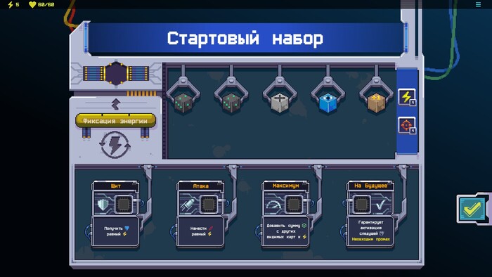 Проще объяснить на примере. Допустим, к началу игрового хода на табло высветились следующие цифры: 1, 1, 2, 3, 4 и 5. Для простоты, представим, что нам доступно всего две карты: атака и щит, а в инвентаре лежат два кубика.