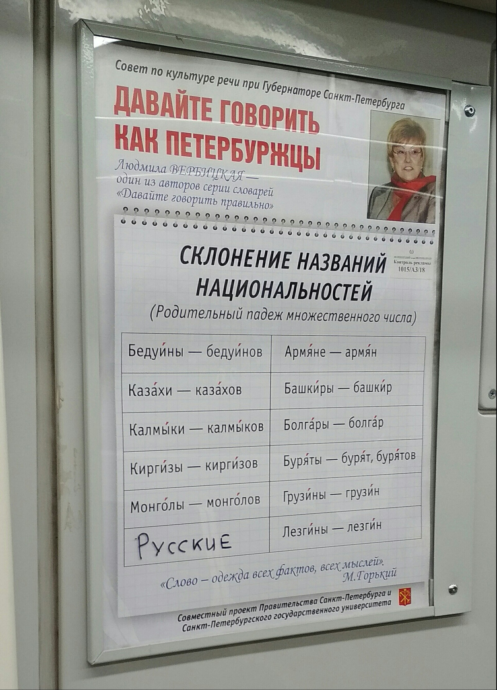 akayntizanyati Перфекционизм 6 лет назад Есть такая традиция в Питере - в метро учить русский язык по плакатам. Во только перфекционизм страдает у дизайна, а самородки дизайна исправили)))П.с. тем кто составлял - можно было татар вписать: татары- татар (а то пишут порой "татаров") [моё] Национальность Перфекционизм Говори по-русски
