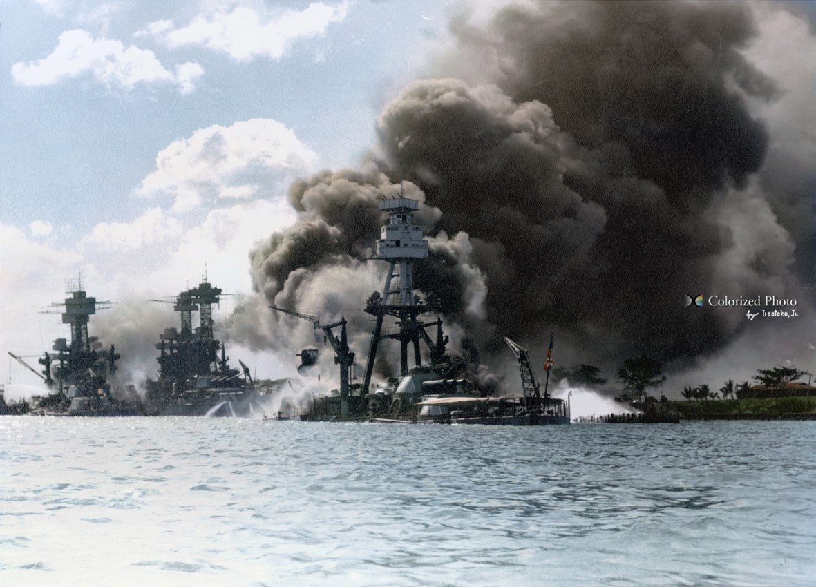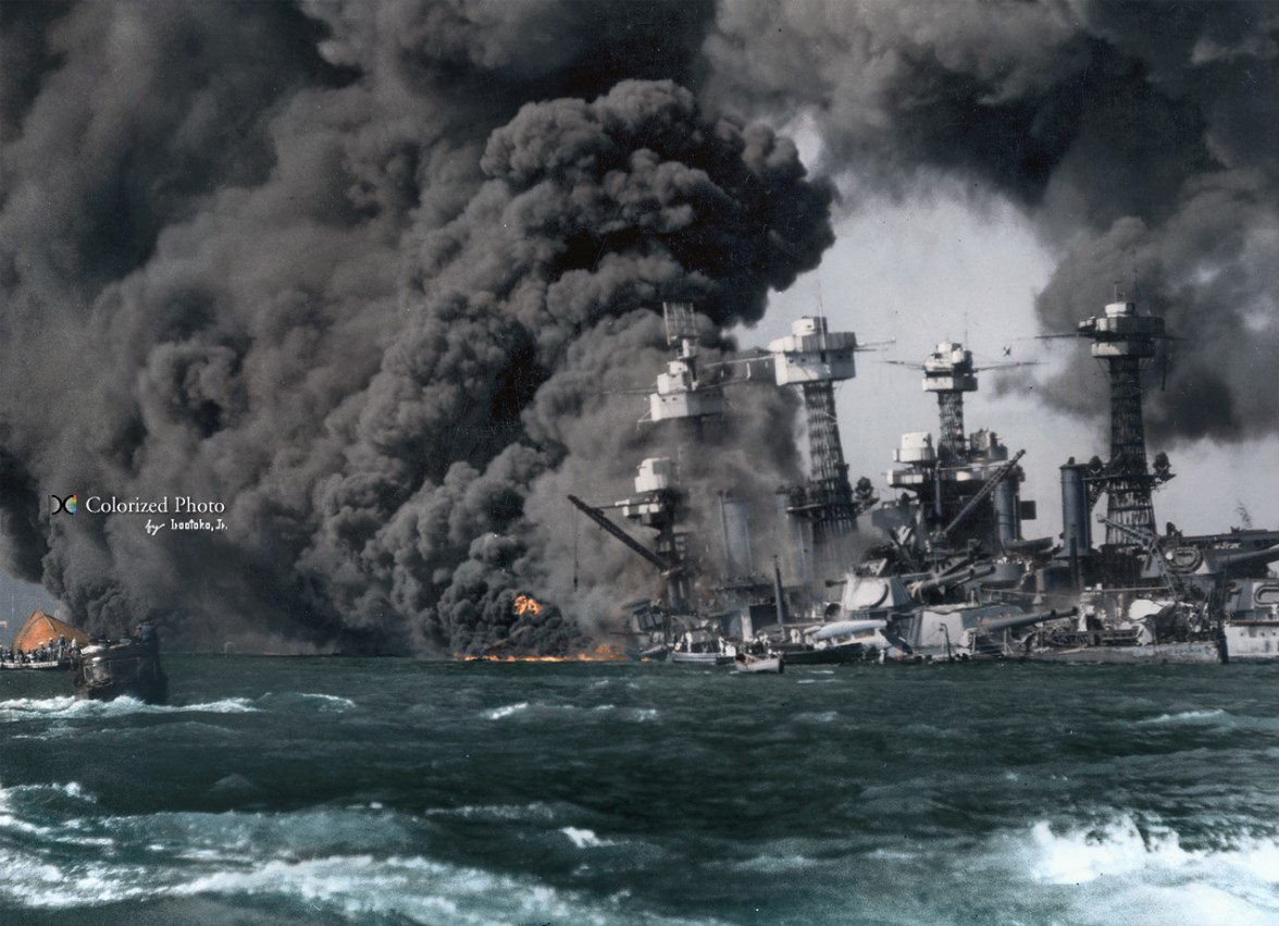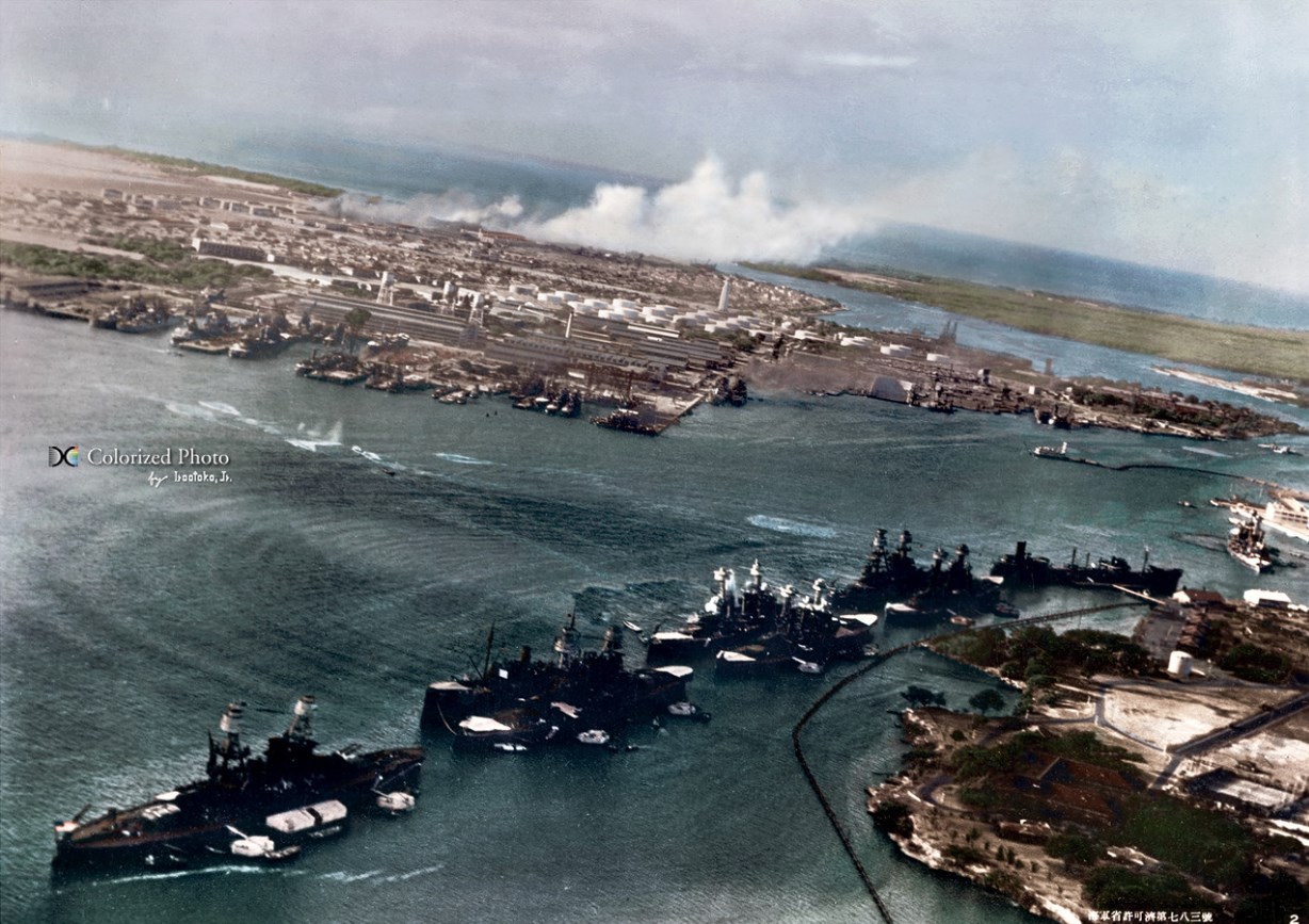 7 декабря 1941 года японская морская авиация при поддержке флота неожиданно напала на американскую базу в Перл-Харборе. В атаке участвовало 414 самолётов, 23 подводных лодки и 5 малых подводных лодок. Американцы, не ожидавшие нападения понесли большие потери: было потоплено 4 линкора, 4 миноносца, повреждено 4 линкора, 1 миноносец и 3 крейсера, уничтожено 188 самолётов, ещё 159 повреждено. Погибло 2395 человек, ранено 1179. Японские потери составили 29 самолётов, 5 малых подводных лодок, 64 человека убитыми и 1 попавший в плен.