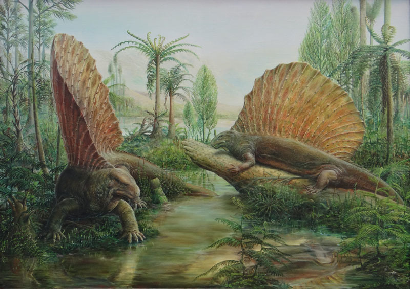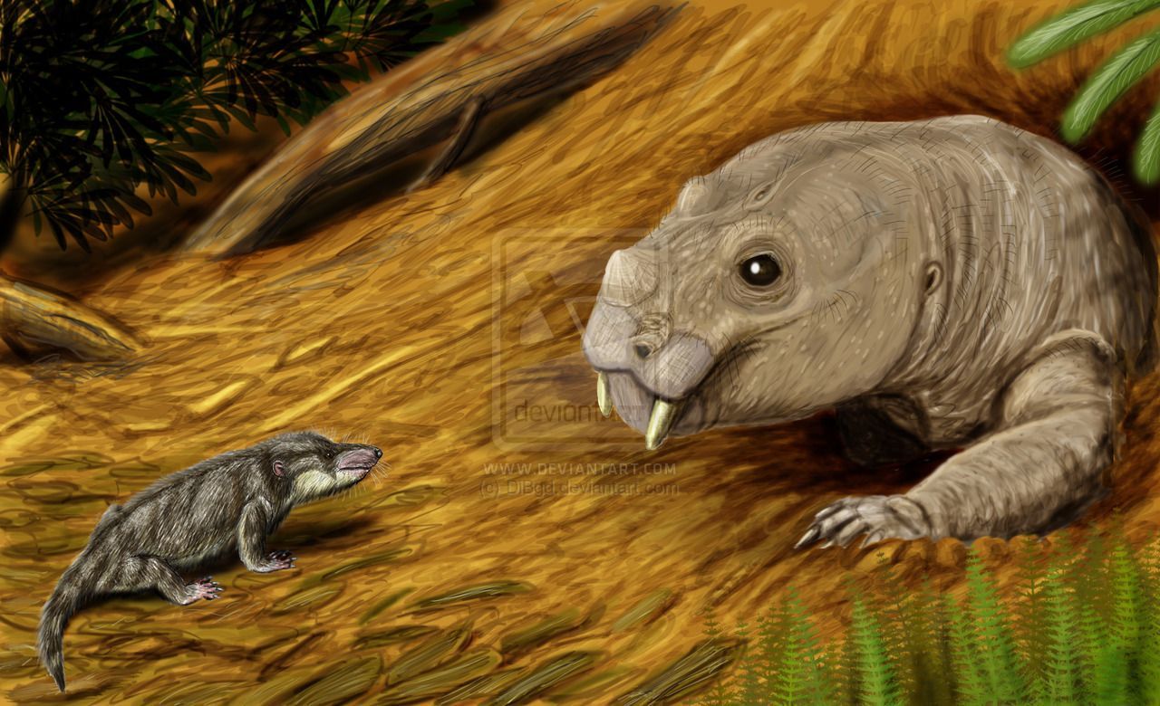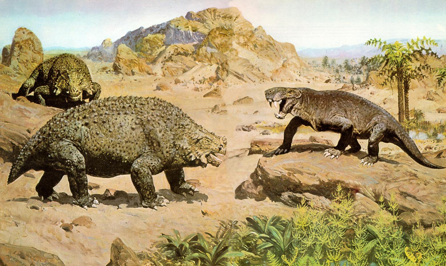 Считается, что травоядным рептилиям для переваривания клетчатки требовался большой желудок. Увеличение желудка влекло за собой увеличение массы туши. Следом за травоядными рептилиями поспевали хищные, что вынуждало ещё более увеличиться растительноядных. Эволюционная гонка размеров порождала всё более и более крупные формы рептилий. И, вероятно, вы уже слышали это о динозаврах, но в пермский период архозавры не имели крупных размеров и пресмыкались к земле, как ныне пресмыкаются ящерицы. Размеры увеличивали представители другой ветви рептилий. Речь идёт о тероморфах, предках млекопитающих. По-видимому, тероморфы блокировали доступ к экологической нише крупных животных архозаврам (к которым относятся динозавры). Должна была случиться страшная катастрофа, чтобы на 186 млн. лет пришли к господству архозавры, заставив наших предков ютиться по норкам в форме мелких зверьков.