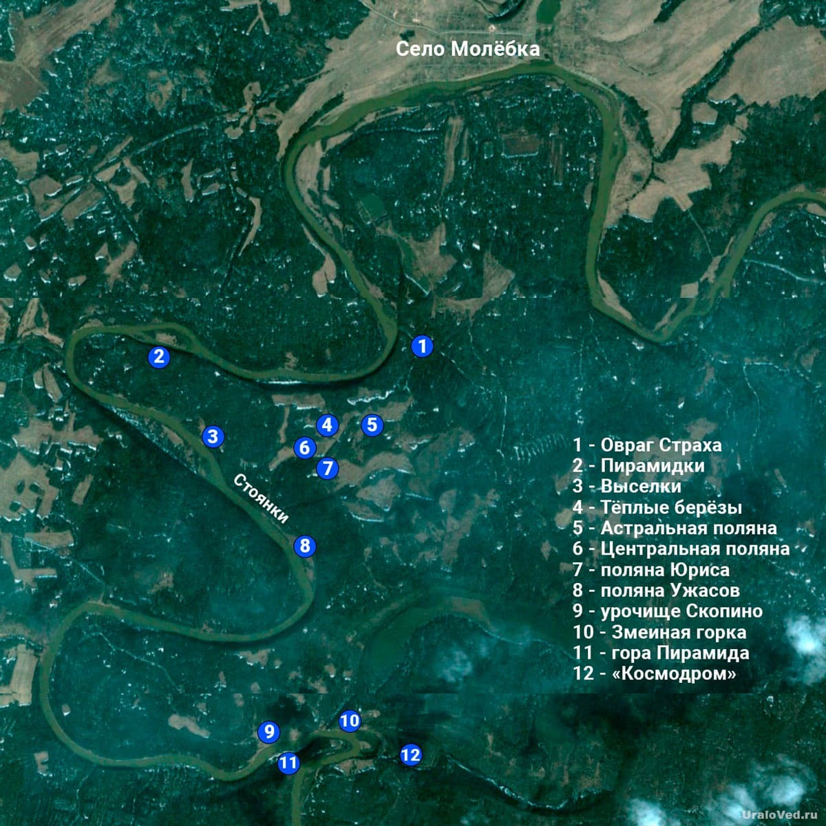 Пребывание в Молёбке превратило эту живописную, но ничем не примечательную уральскую землю в объект паломничества любителей аномального, обрастая множеством легенд и собственной уникальной топонимикой. Многие названия мест здесь поражают воображение, но следует воспринимать их как современный вариант устного народного творчества. Когда посетитель ожидает встречи с непознанным, прогулка по, например, поляне Ужасов или Астральной поляне создает более сильное впечатление, чем обычная лесная прогулка. Именно поэтому подобная "аномальная" народная топонимика быстро укоренилась среди путешественников. Я расскажу вам о ключевых местах в Пермской (Молёбской) аномальной зоне.