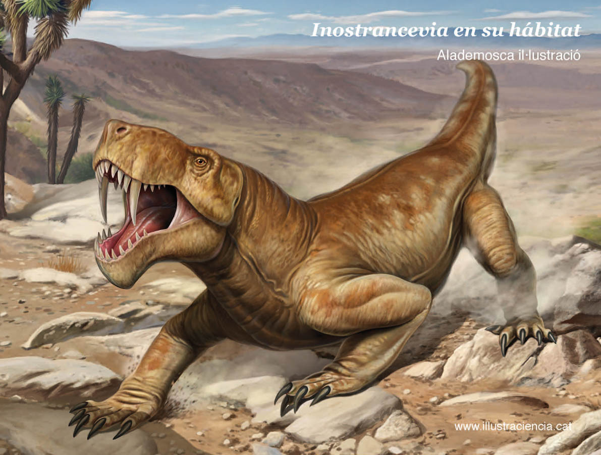 Иностранцевия. Если уж затронули саблезубых дальних родственников, стоит упомянуть и об этом. Крупнейший гаргонопс перми, апекс-хищник того времени. Менее родственный нам, нежели Горыныч. Назван в честь геолога А. Иностранцева.