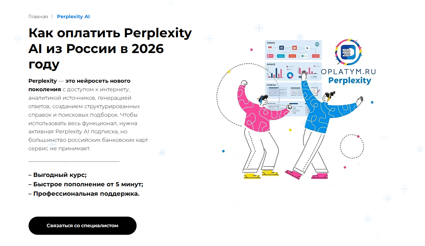Этот способ чаще всего выбирают, когда задача — оплатить Perplexity из России с гарантированным результатом. Oplatym работает как посредник: пользователь не сталкивается с отказами платёжных систем и сразу понимает, что перплексити будет применена к аккаунту.