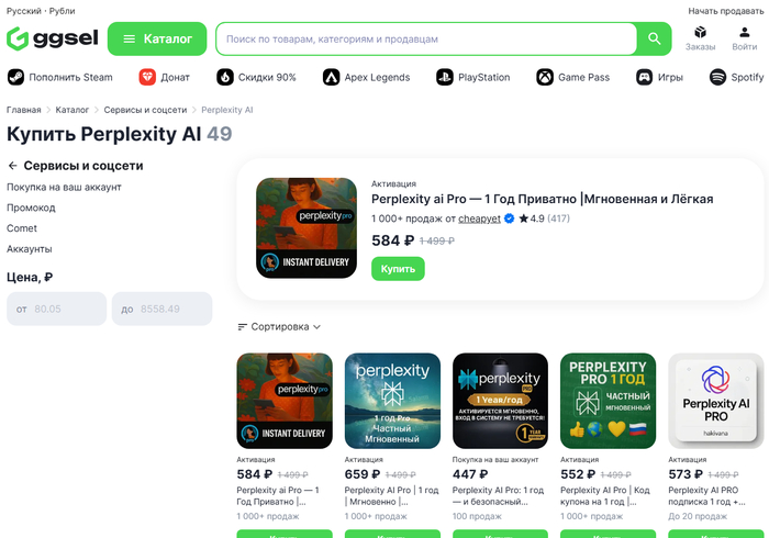 Один из самых простых и безопасных способов — использовать цифровые маркетплейсы, где уже адаптированы рабочие решения для пользователей из РФ. Например, на GGSEL.net можно найти готовые аккаунты с активной подпиской или ключи для самостоятельной активации. Такой путь: